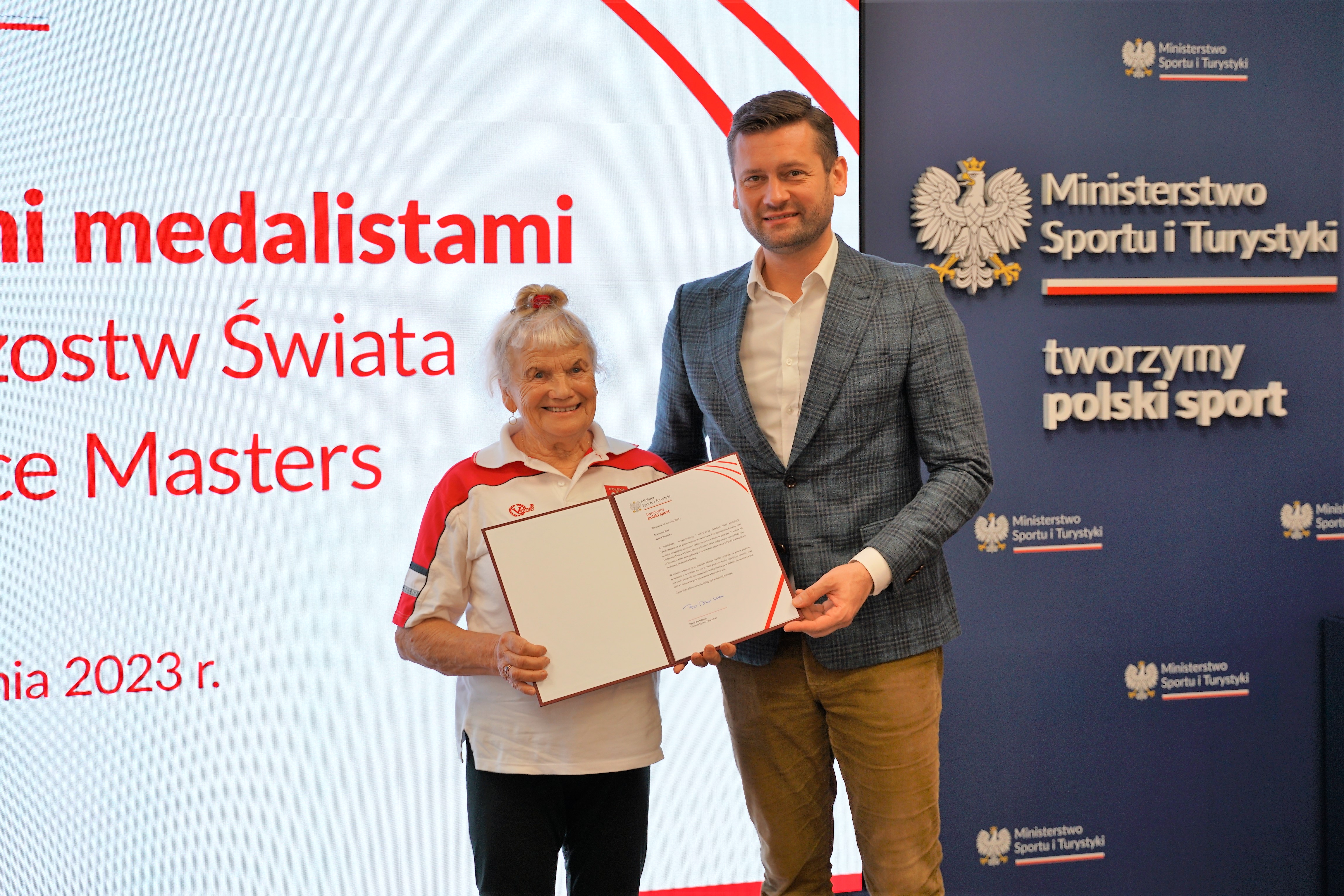 Na spotkaniu z ministrem Bortniczukiem zjawili się także jedni z najstarszych uczestników HMŚ, multimedaliści tej imprezy – pani Janina Rosińska startująca w kat. do 85 lat i 90-letni pan Czesław Pluszczewski.
