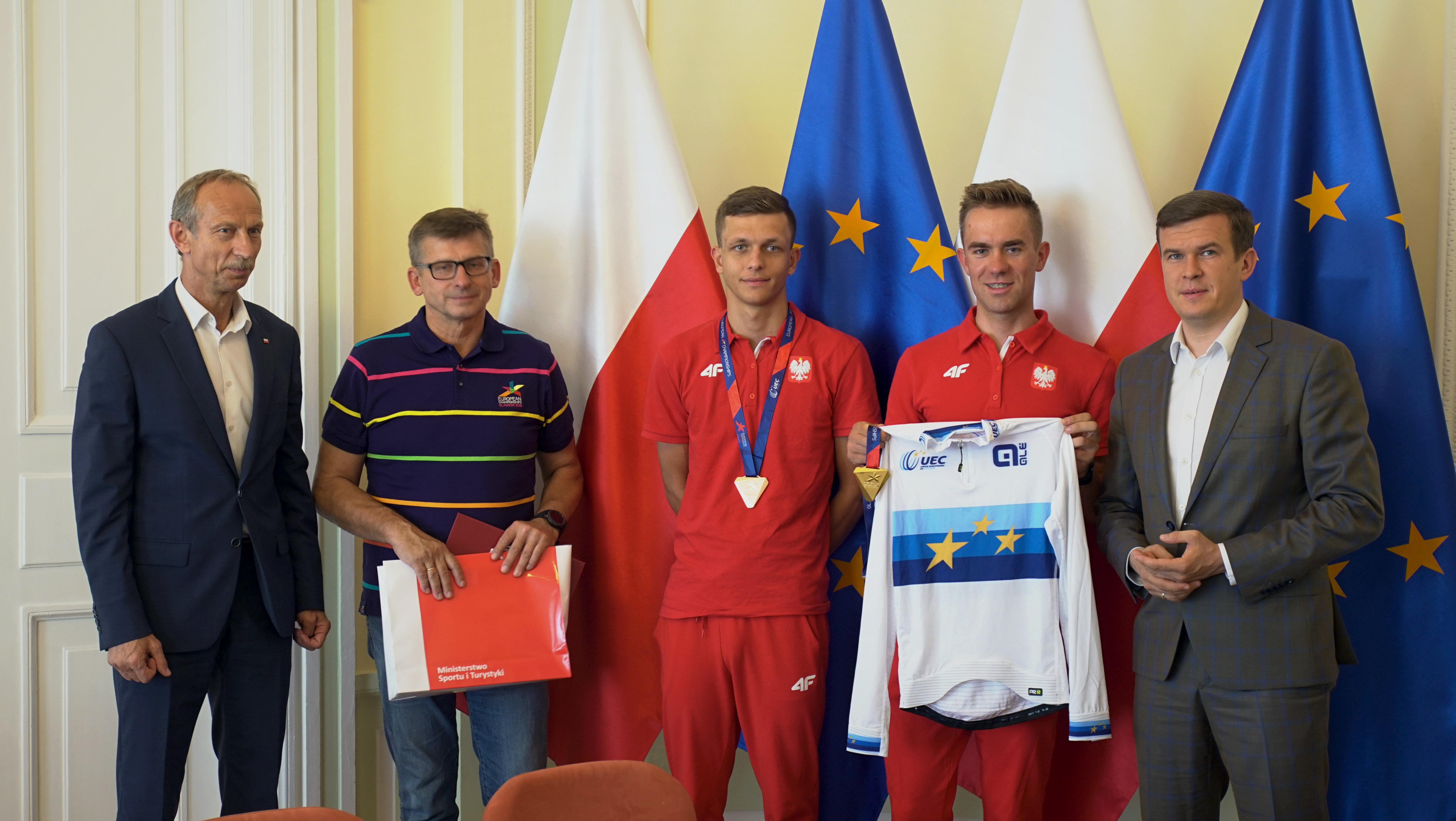 W czwartek 9 sierpnia br. w Ministerstwie Sportu i Turystyki odbyło się spotkanie z medalistami Mistrzostw Europy w Kolarstwie Torowym. W wydarzeniu uczestniczył Minister Sportu i Turystyki Witold Bańka, Podsekretarz Stanu w MSiT Jan Widera, Dyrektor Departamentu Sportu Wyczynowego MSiT Marcin Nowak, zawodnicy: Wojciech Pszczolarski i Szymon Krawczyk oraz trener Jacek Kasprzak.
