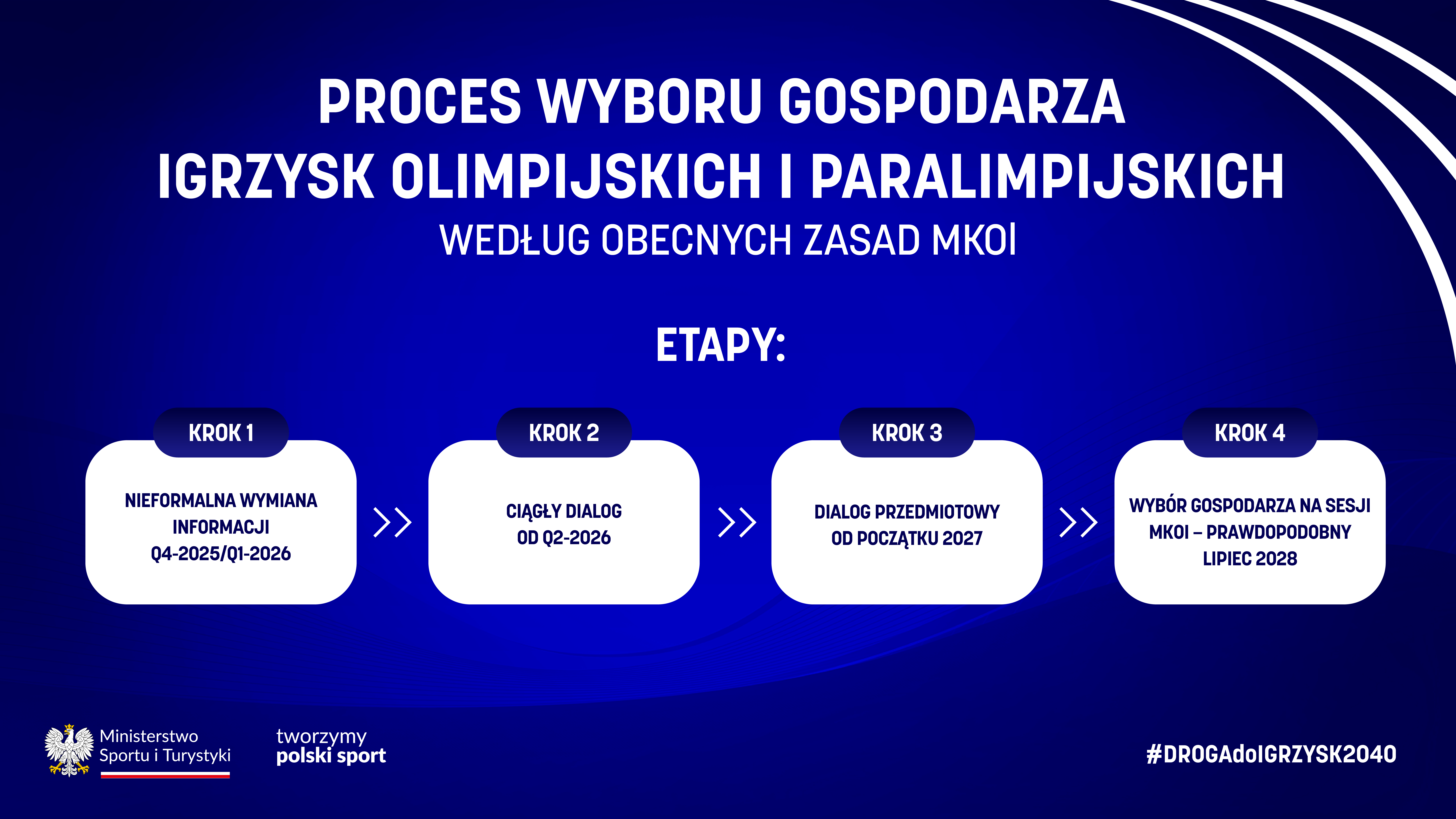 Głównym celem strategii jest ubieganie się przez Polskę o organizację igrzysk olimpijskich i paralimpijskich. Proces wyboru gospodarza składa się z czterech etapów. Pierwszy z nich trwający w ostatnim kwartale bieżącego roku i w pierwszym kwartale roku przyszłego obejmuje nieformalną wymianę informacji. Po nim nastąpi ciągły dialog, a następnie, od początku 2027 r., dialog przedmiotowy. Gospodarza igrzysk poznamy najprawdopodobniej w lipcu 2028 r. podczas sesji MKOl.
