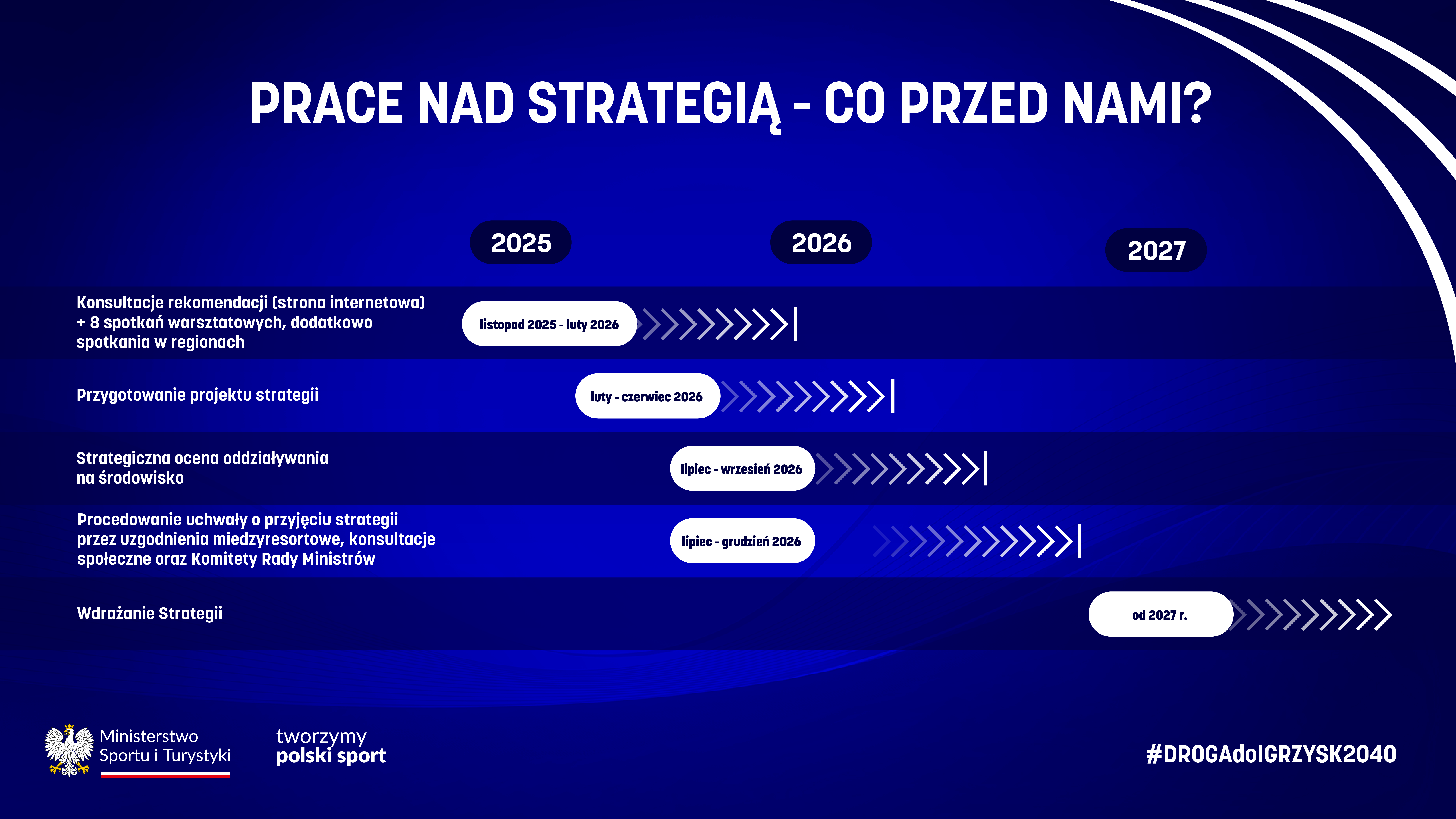 Rok po ogłoszeniu rozpoczęcia prac nad dokumentem Strategia Rozwoju Polskiego Sportu 2040 na stadionie PGE Narodowy w Warszawie odbyło się spotkanie poświęcone ich kolejnym etapom. W spotkaniu udział wzięli minister sportu i turystyki Jakub Rutnicki, prezydent Warszawy Rafał Trzaskowski, członkini MKOl, dwukrotna wicemistrzyni olimpijska Maja Włoszczowska, sekretarz stanu w Ministerstwie Sportu i Turystyki Piotr Borys, doradca ministra sportu i turystyki, czterokrotny mistrz olimpijski Robert Korzeniowski, a także prezesi polskich związków sportowych, sportowcy, przedstawiciele ministerstw, spółek Skarbu Państwa, organizacji sportowych oraz mediów.