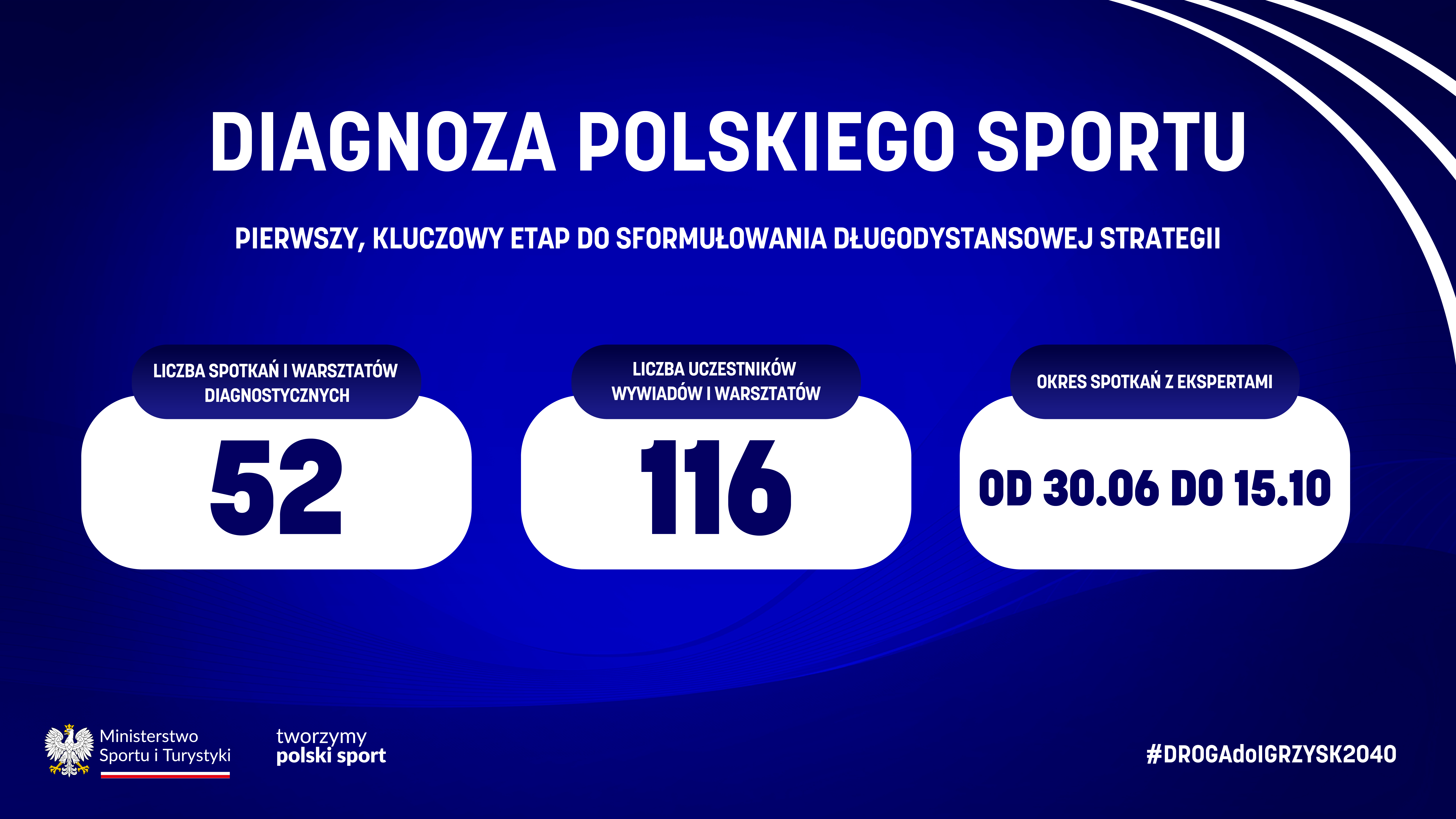 Pierwszym – kluczowym etapem do sformułowania długodystansowej strategii była diagnoza polskiego sportu. W jej ramach między 30 czerwca a 15 października br. odbyły się 52 spotkania i warsztaty diagnostyczne, w których uczestniczyło łącznie 116 osób.