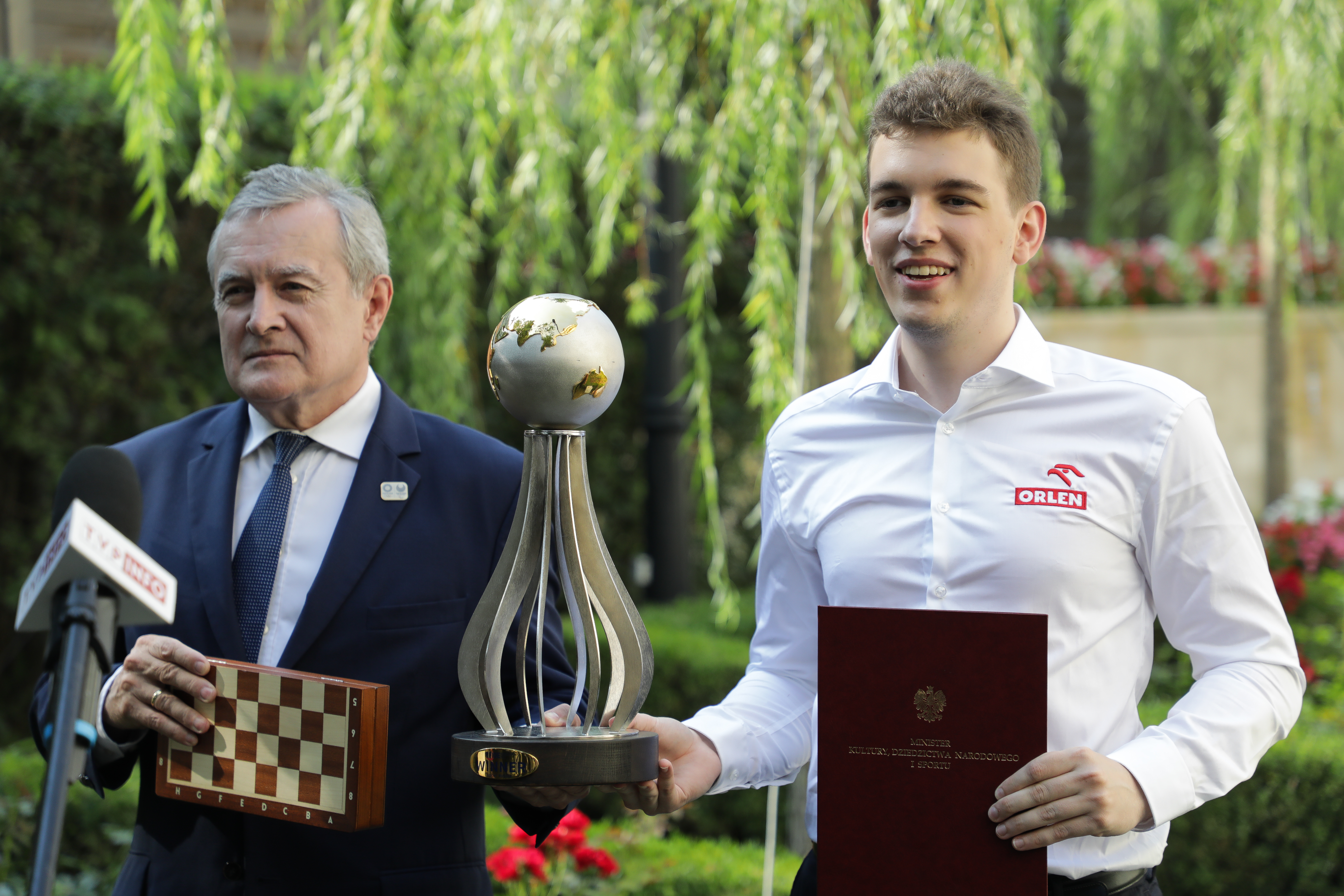 Bardzo dziękuję za wyróżnienie. Szachy dają wiele umiejętności, które można wykorzystać w życiu. Cieszę się, że dołączyłem dziś do grupy sportowców PKN Orlen - powiedział arcymistrz Jan-Krzysztof Duda, który podarował wicepremierowi Glińskiemu szachy oraz książkę Garriego Kasparowa. Zdobywca Pucharu Świata pokazał też zgromadzonym w ogrodach MDKNiS dziennikarzom cenne trofeum.