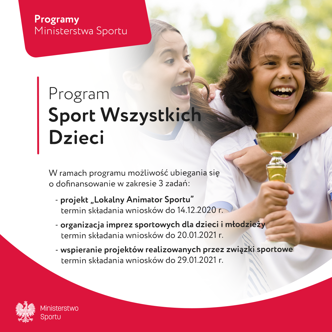 Ruszył nabór wniosków do Programu „Sport Wszystkich Dzieci” w ramach rozwijania sportu poprzez wspieranie przedsięwzięć z zakresu upowszechniania sportu dzieci i młodzieży. Na jego realizację w 2021 roku przeznaczono kwotę 49 mln zł.