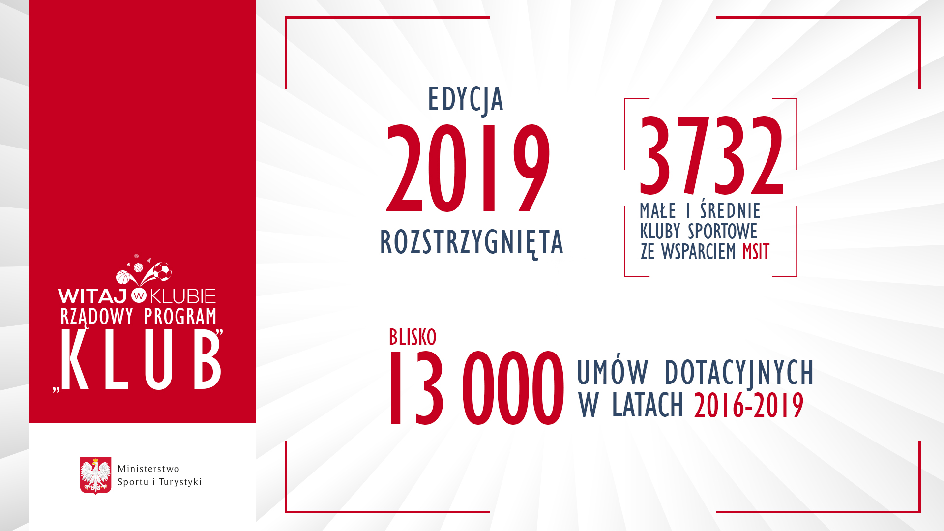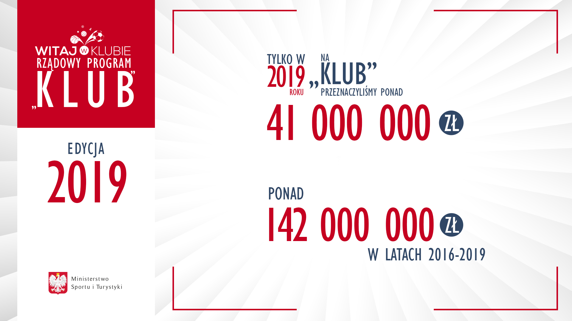 Ministerstwo Sportu i Turystyki w latach 2016-2019 przeznaczyło ponad 142 mln zł na realizację Rządowego Programu „KLUB”.