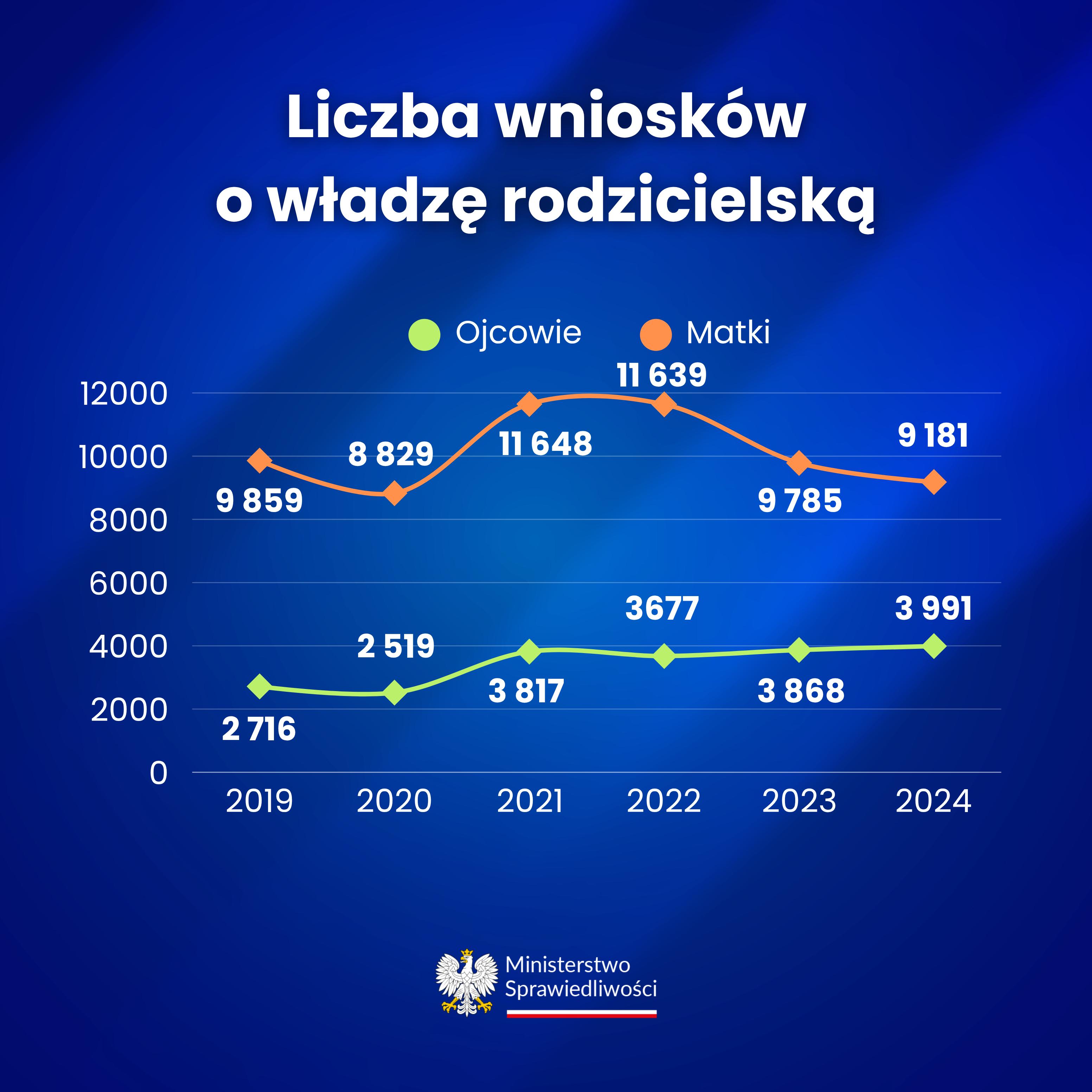 Dane statystyczne zebrane przez Ministerstwo Sprawiedliwości wskazują na wyraźny trend – ojcowie coraz częściej ubiegają się o powierzenie im wykonywania władzy rodzicielskiej w sprawach o rozwód i separację. W 2019 roku stanowili zaledwie 8,5% wnioskodawców, natomiast w 2024 roku już 13%. Choć nadal są w mniejszości, widoczna jest wyraźna tendencja wzrostowa zarówno pod względem liczby składanych wniosków, jak i skuteczności ich rozpatrywania.