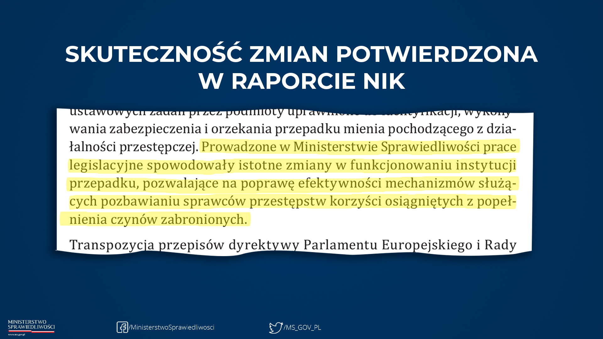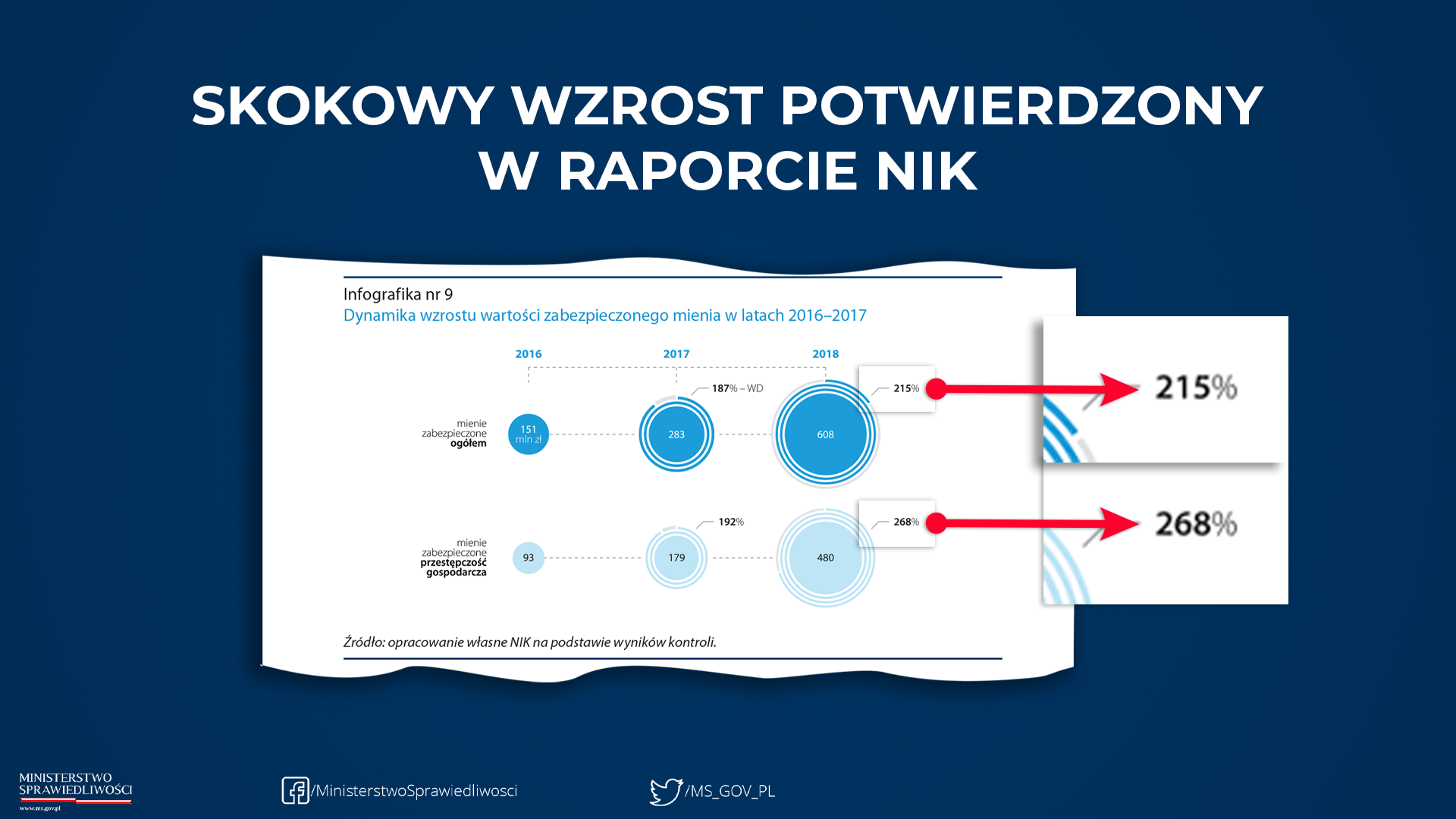 Podawane przez Najwyższą Izbę Kontroli informacje, jakoby „tylko niewielką część majątku z przestępstw udaje się odzyskać”, są nieprawdziwe. W rzeczywistości są to ogromne sumy, wielokrotnie większe niż w czasach rządów PO-PSL. Dzięki wprowadzeniu tzw. konfiskaty rozszerzonej wartość zabezpieczonego przestępczego mienia sięgnęła w 2019 r. 3,9 mld zł. Dla porównania – w 2015 roku, który był ostatnim rokiem rządów PO-PSL - wynosiła zaledwie 755 mln zł.
