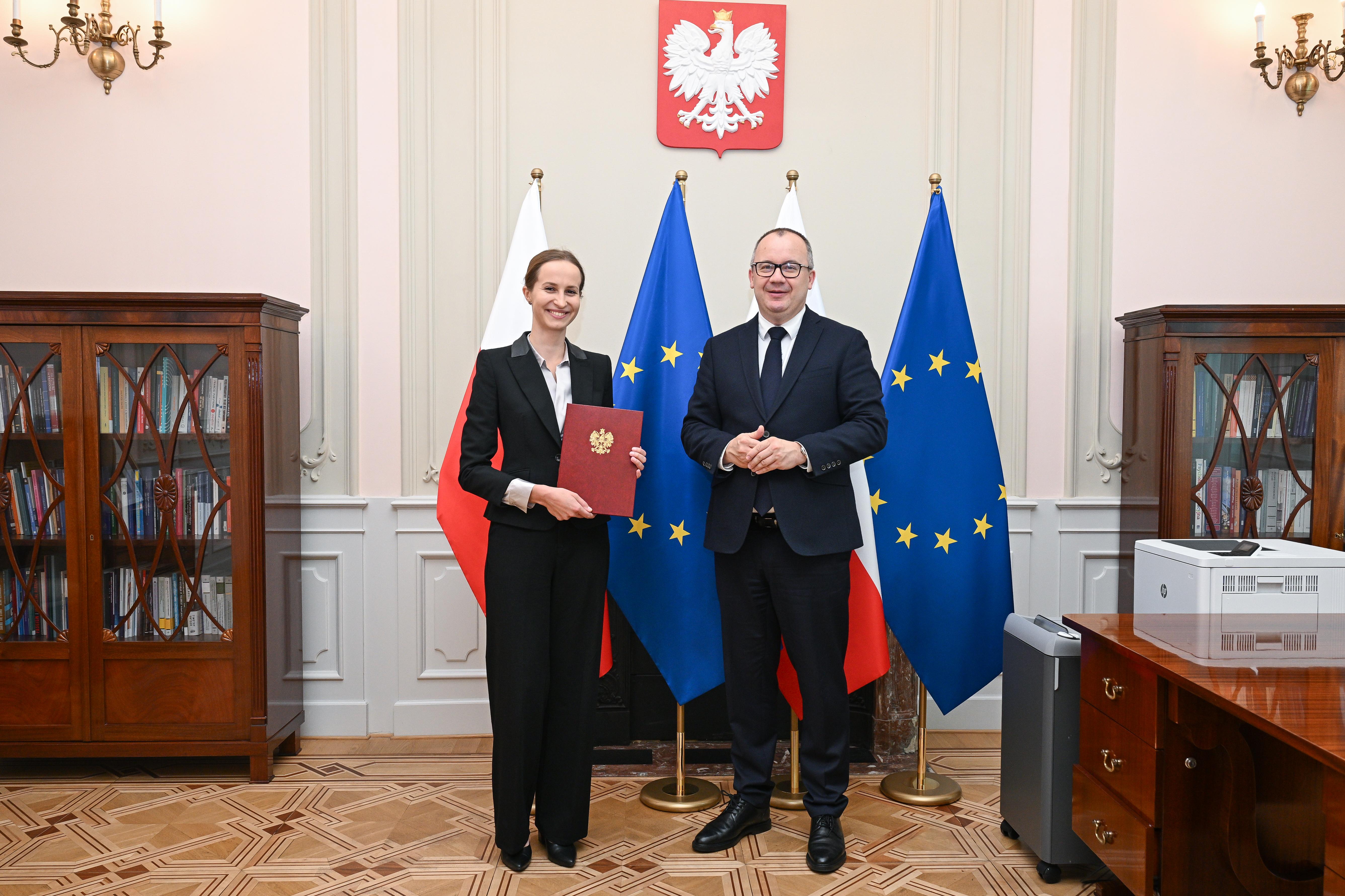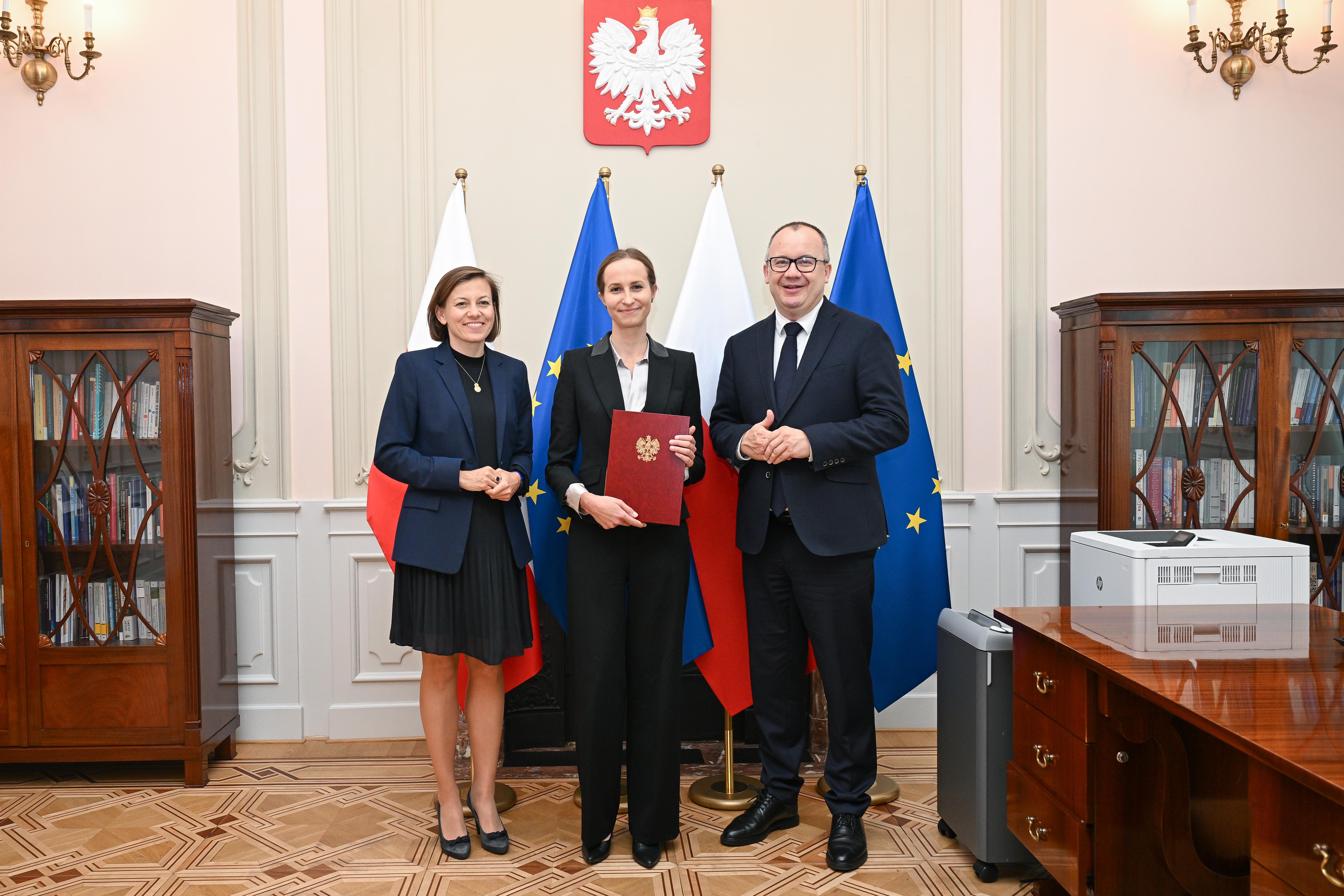 Aleksandra Chudaś otrzymała dziś (11.06.2024 r.) z rąk ministra Adama Bodnara powołanie na funkcję Pełnomocniczki Ministra Sprawiedliwości do spraw edukacji konstytucyjnej. W uroczystości powołania uczestniczyła również Wiceministra Sprawiedliwości Zuzanna Rudzińska-Bluszcz.