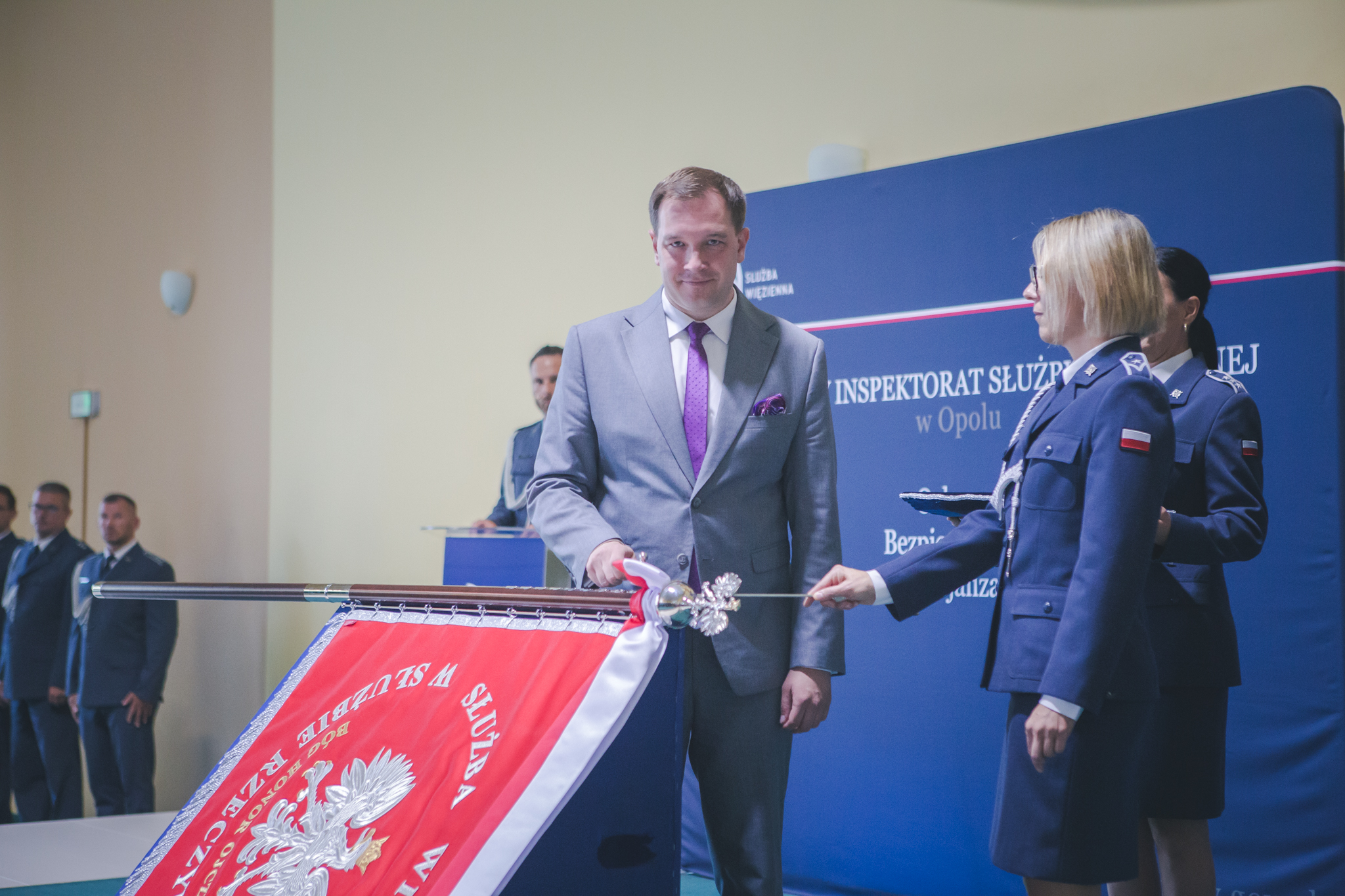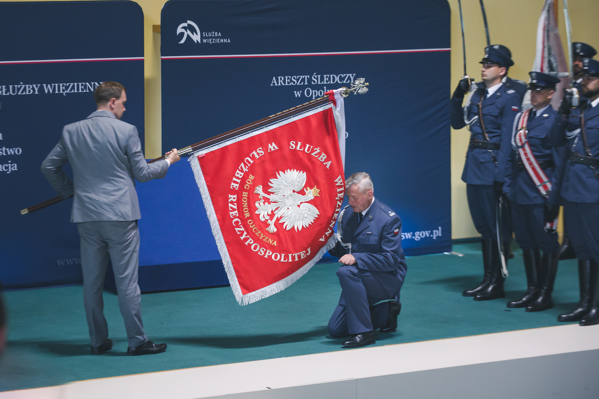 W uroczystości wręczenia sztandaru, ufundowanego przez Polską Grupę SW Przedsiębiorstwo Państwowe, uczestniczyli też m.in. wiceminister rolnictwa i rozwoju wsi Janusz Kowalski, Zastępca Dyrektora Generalnego Służby Więziennej płk Krzysztof Stefanowski, Dyrektor Okręgowy Służby Więziennej w Opolu płk Andrzej Tesarewicz, przedstawiciele administracji samorządowej, funkcjonariusze służb mundurowych oraz reprezentanci świata nauki. W drzewce sztandaru zostały wbite gwoździe z datą nadania Aresztowi Śledczemu sztandaru, a goście wpisali się do księgi pamiątkowej.