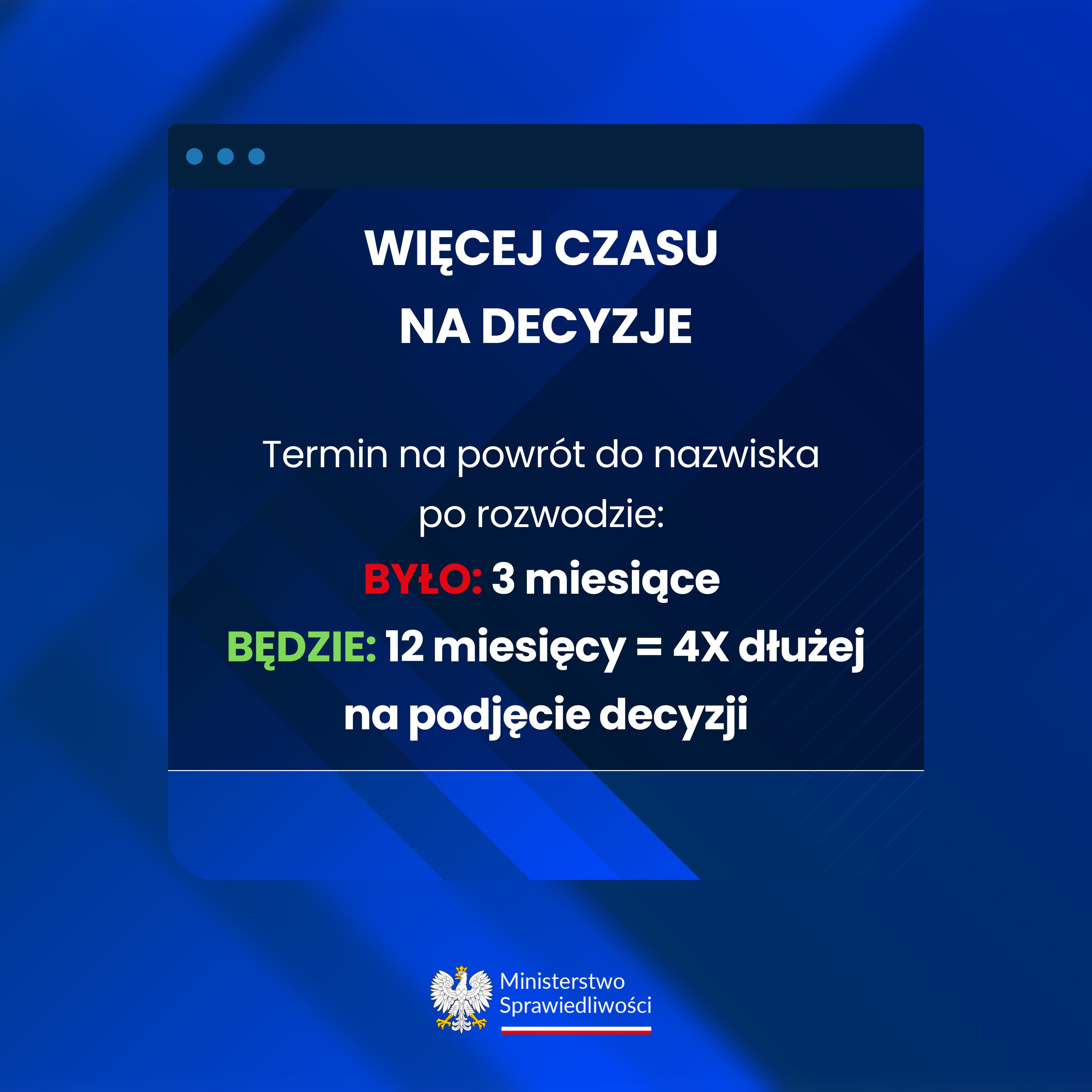 Projekt nowelizacji Kodeksu rodzinnego i opiekuńczego ma zapewnić małżonkom, którzy podczas zawarcia małżeństwa zmienili nazwisko, a następnie się rozwiedli, dłuższy termin na złożenie oświadczenia o powrocie do nazwiska.