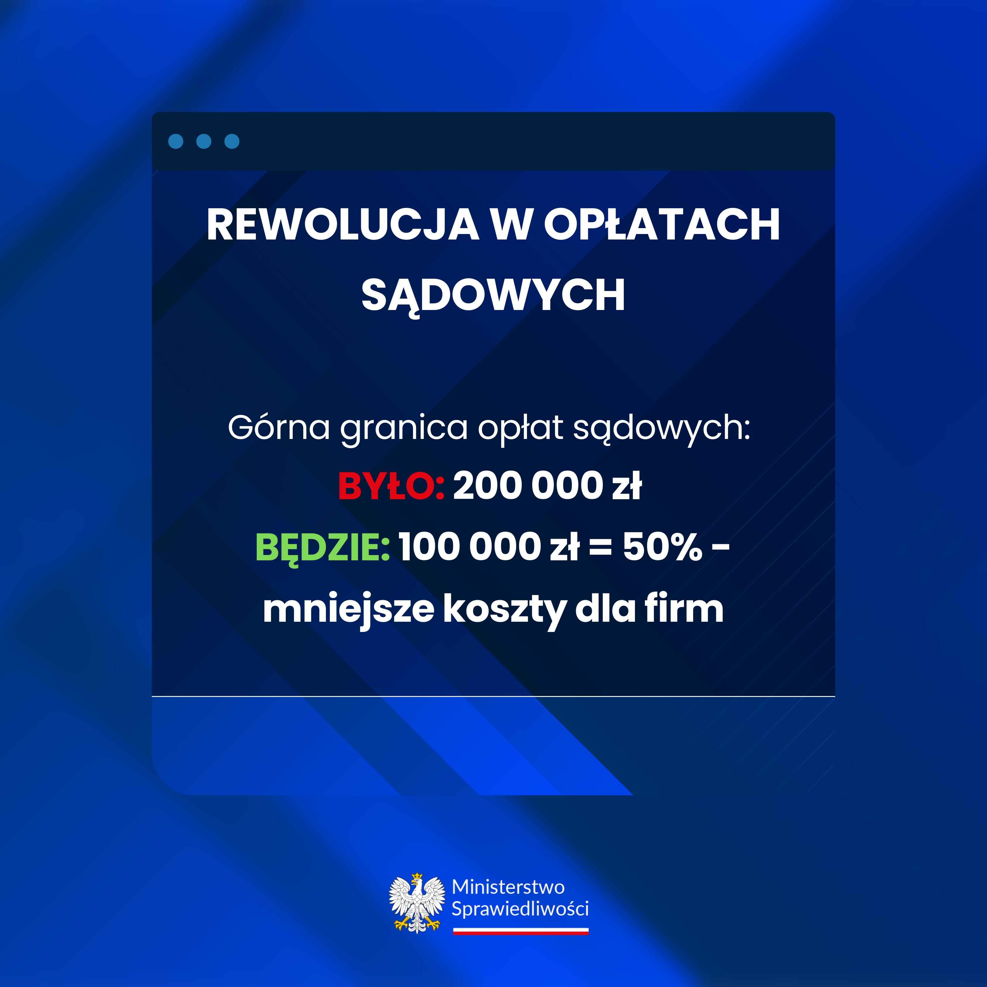 - Górna granica stosunkowej opłaty sądowej od pisma w sprawach o prawa majątkowe zostaje obniżona z 200 tys. zł. do 100 tys. zł.
