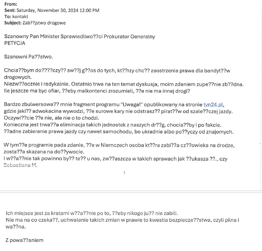 Przedmiotowa petycja (która pierwotnie wpłynęła do KPRM w dniu 30 listopada 2024 r.; przekazana została do Ministerstwa Sprawiedliwości w dniu 2 grudnia 2024 r.) dotyczy zaostrzenia przepisów prawa i wprowadzenia tzw. “zabójstwa drogowego”.