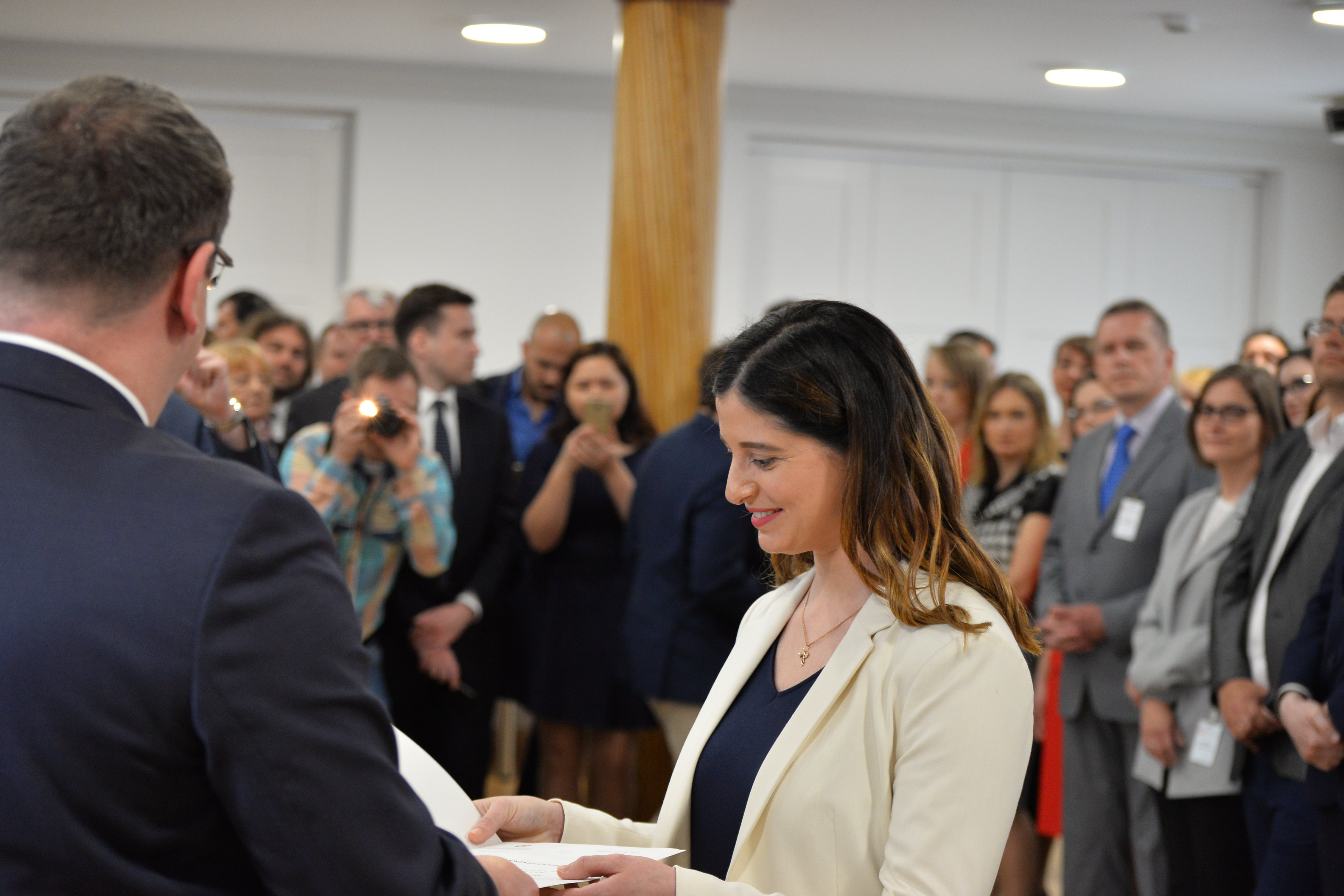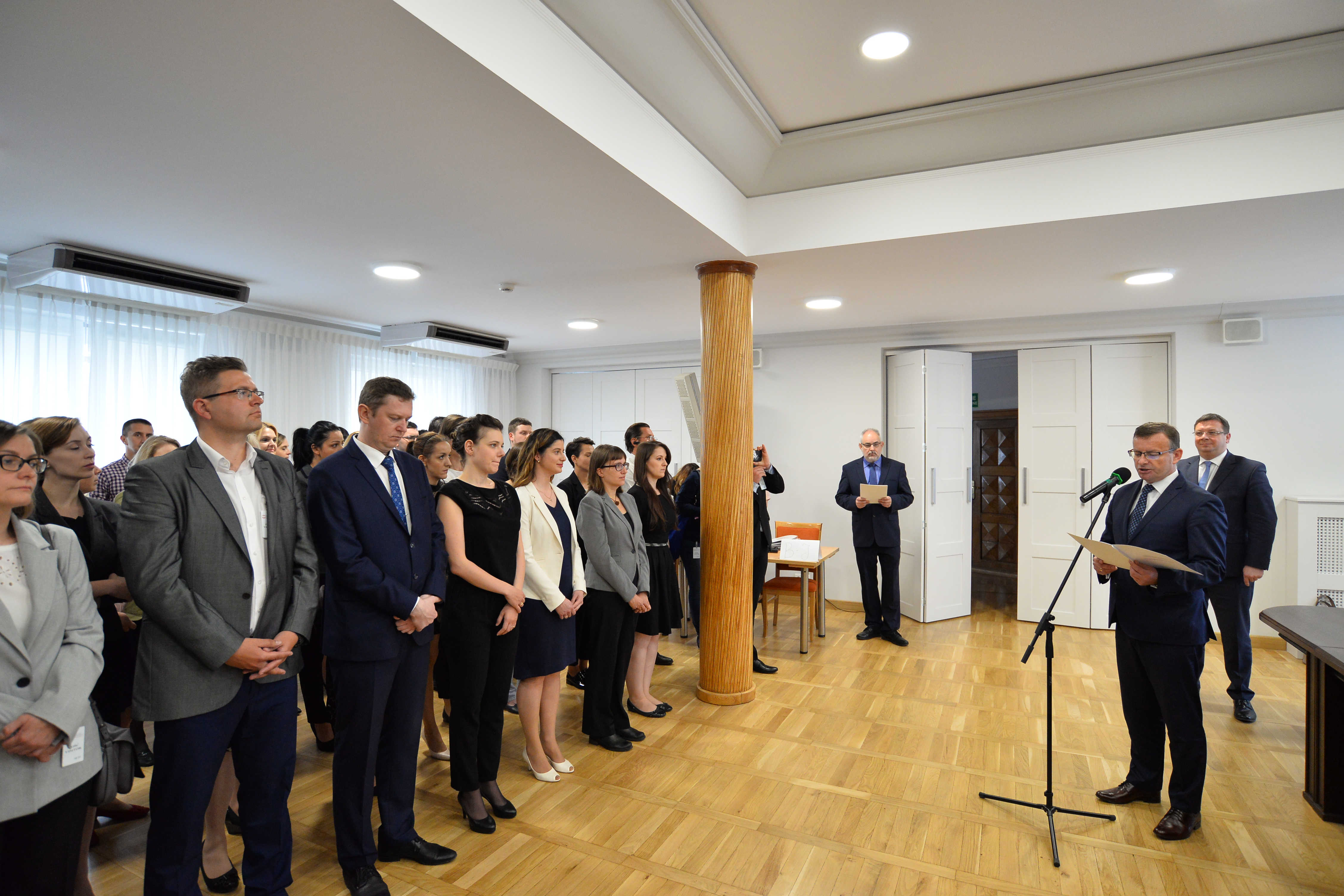 W Ministerstwie Sprawiedliwości zostali dziś uroczyście zaprzysiężeni nowi tłumacze przysięgli. To specjaliści z takich języków jak angielski, rosyjski, czy niemiecki, ale też mniej popularnych w Polsce, jak islandzki, czy norweski. Ślubowanie przyjął Sekretarz Stanu Michał Wójcik.