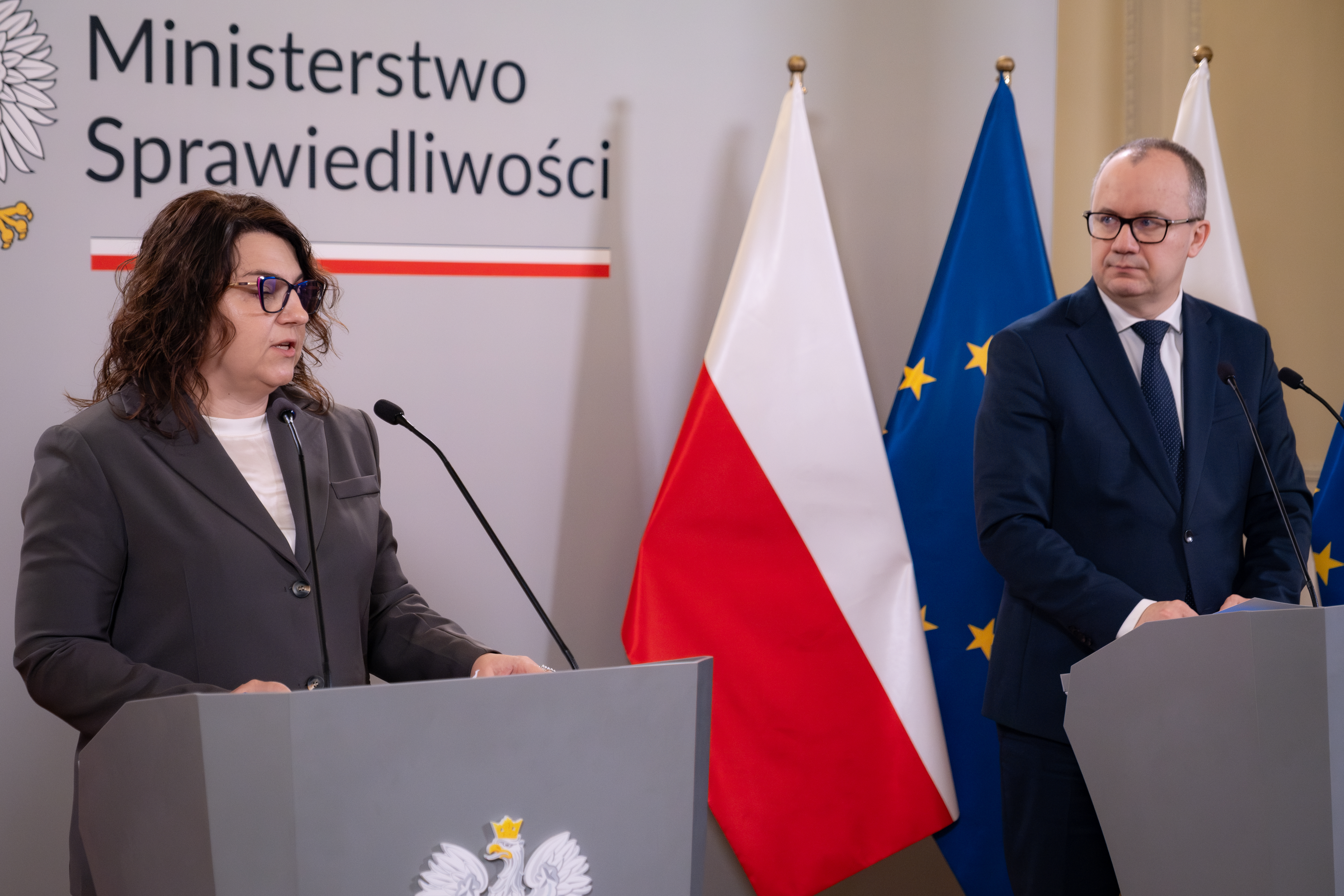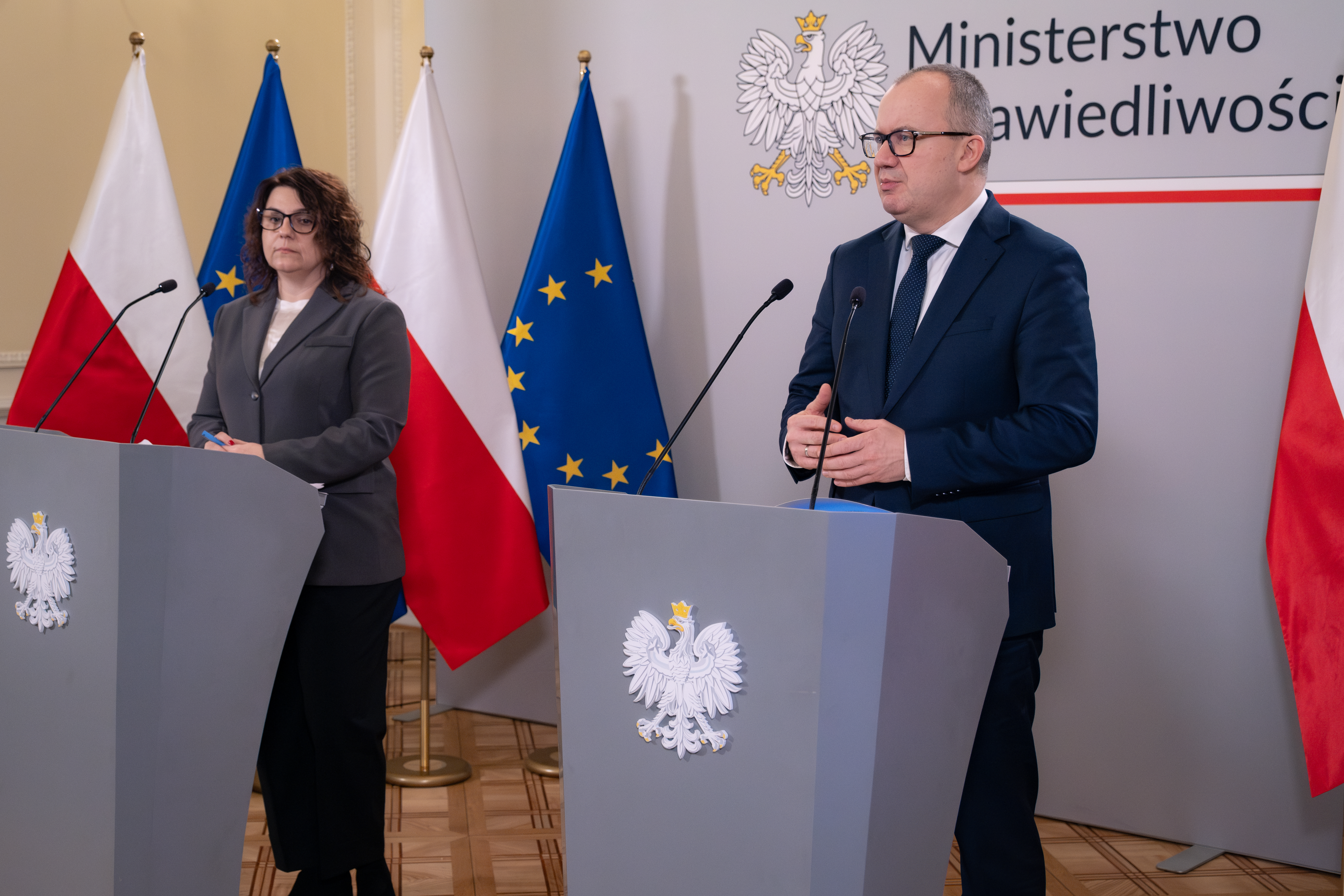 Minister Sprawiedliwości Adam Bodnar i Dyrektorka Departamentu Prawa Europejskiego w Ministerstwie Sprawiedliwości Małgorzata Pawelec przedstawili priorytety polskiej prezydencji w Radzie Unii Europejskiej w wymiarze sprawiedliwości. Polska prezydencja potrwa od 1 stycznia do 30 czerwca 2025 r.