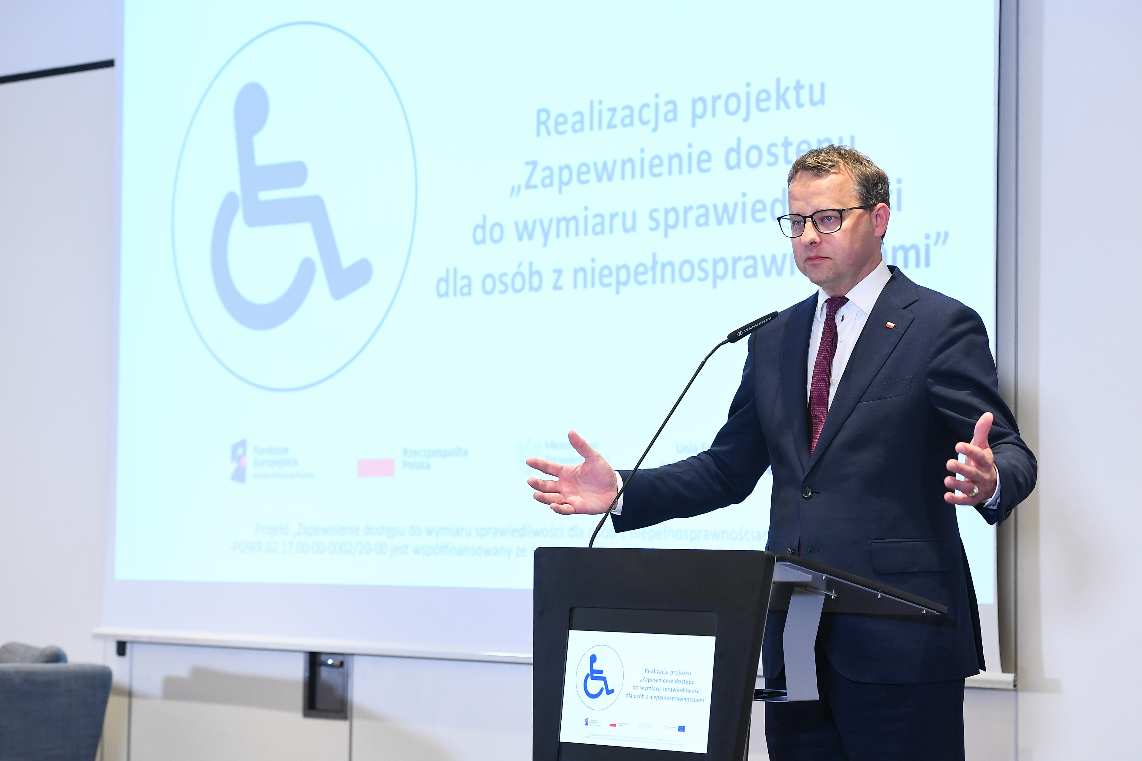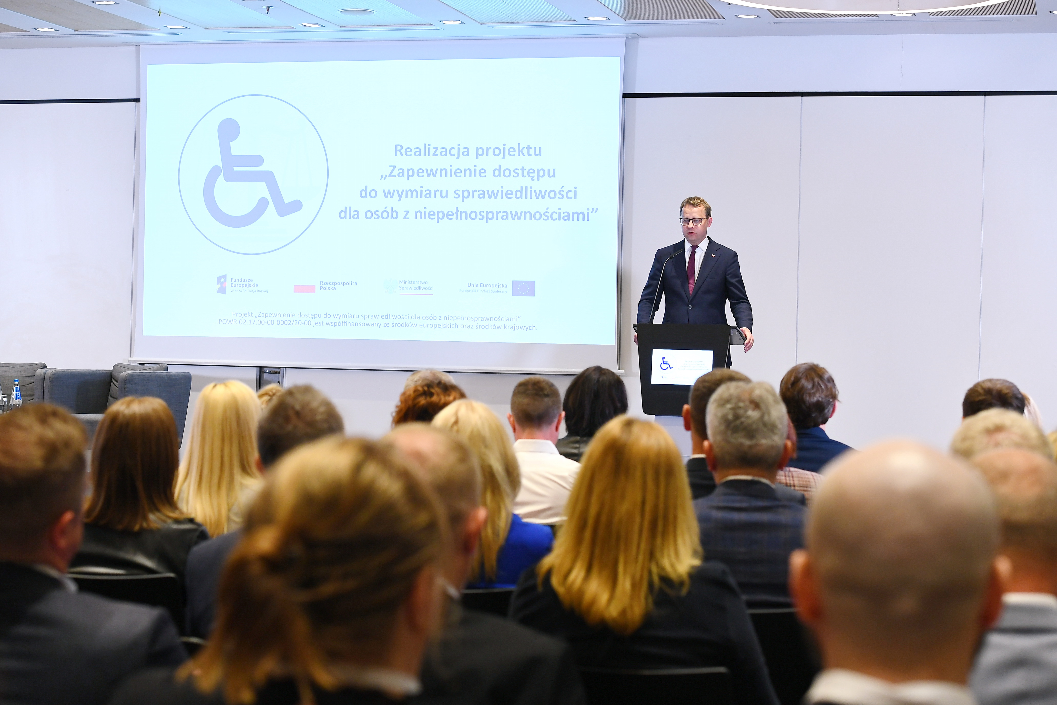 Wiceminister Marcin Romanowski nakreślił główne cele niezwykle ważnego dla Ministerstwa Sprawiedliwości programu. Przedsięwzięcie zostało sfinansowane ze środków budżetu państwa, bezzwrotnej pomocy zagranicznej w ramach Programu Operacyjnego Wiedza Edukacja Rozwój 2014-2020 oraz Europejskiego Funduszu Społecznego. W wydarzeniu udział wzięła również wiceminister sprawiedliwości Katarzyna Frydrych, która zwróciła uwagę na podnoszenie kompetencji pracowników wymiaru sprawiedliwości w zakresie potrzeb osób z niepełnosprawnościami. Dzięki projektowi szkoleniami objęto 3450 osób.