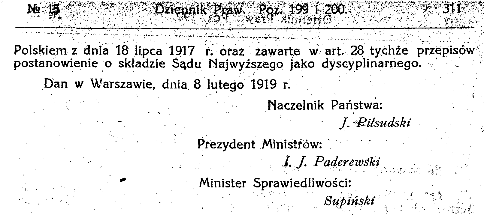 Takim rozwiązaniem był Dekret Naczelnika Państwa Józefa Piłsudskiego z 8 lutego 1919 r. w przedmiocie ustroju Sądu Najwyższego, który powierzył funkcję Prokuratora Naczelnego Ministrowi Sprawiedliwości. Akt prawny wprowadził stanowiska prokuratorów i podprokuratorów pełniących urząd przy Sądzie Najwyższym oraz stanowisko Pierwszego Prokuratora.