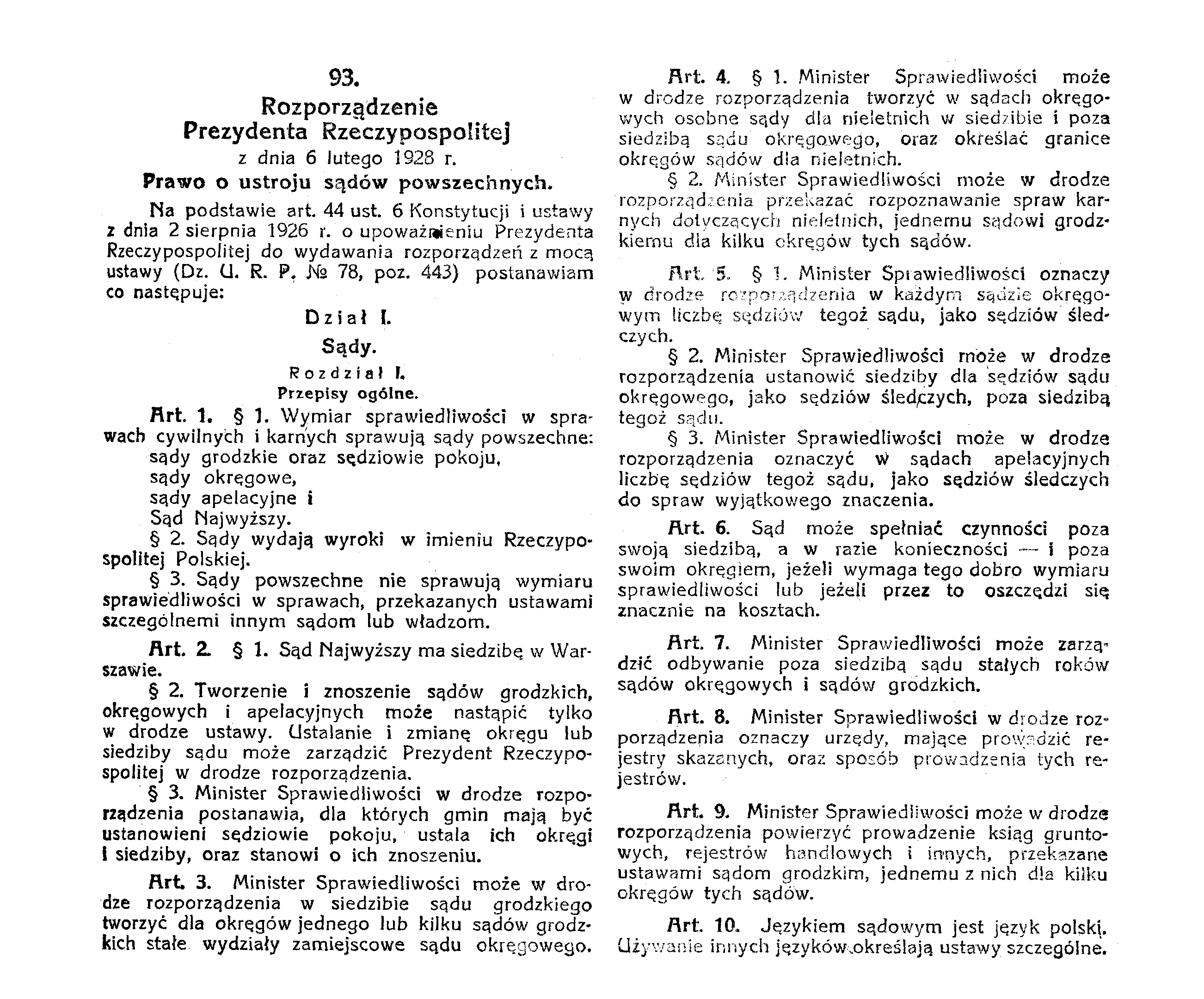 Rozporządzeniem Prezydenta RP z 6 lutego 1928 r. wprowadzono prawo o ustroju sądów powszechnych. Zunifikowano ustrój sądownictwa i prokuratury. Określono, że wymiar sprawiedliwości w sprawach cywilnych i karnych sprawują sądy powszechne: grodzkie oraz sędziowie pokoju, okręgowe, apelacyjne i Sąd Najwyższy. Prokuraturę oparto na zasadzie centralizmu i hierarchicznego podporządkowania. Naczelnym Prokuratorem był Minister Sprawiedliwości. Przy Sądzie Najwyższym pełnili obowiązki służbowe: pierwszy prokurator, prokuratorzy i wiceprokuratorzy, przy sądach apelacyjnych: prokuratorzy i wiceprokuratorzy apelacyjni; przy sądach okręgowych: prokuratorzy, wiceprokuratorzy i podprokuratorzy okręgowi. Przy sądach grodzkich Minister Sprawiedliwości mógł ustanowić podprokuratorów okręgowych.