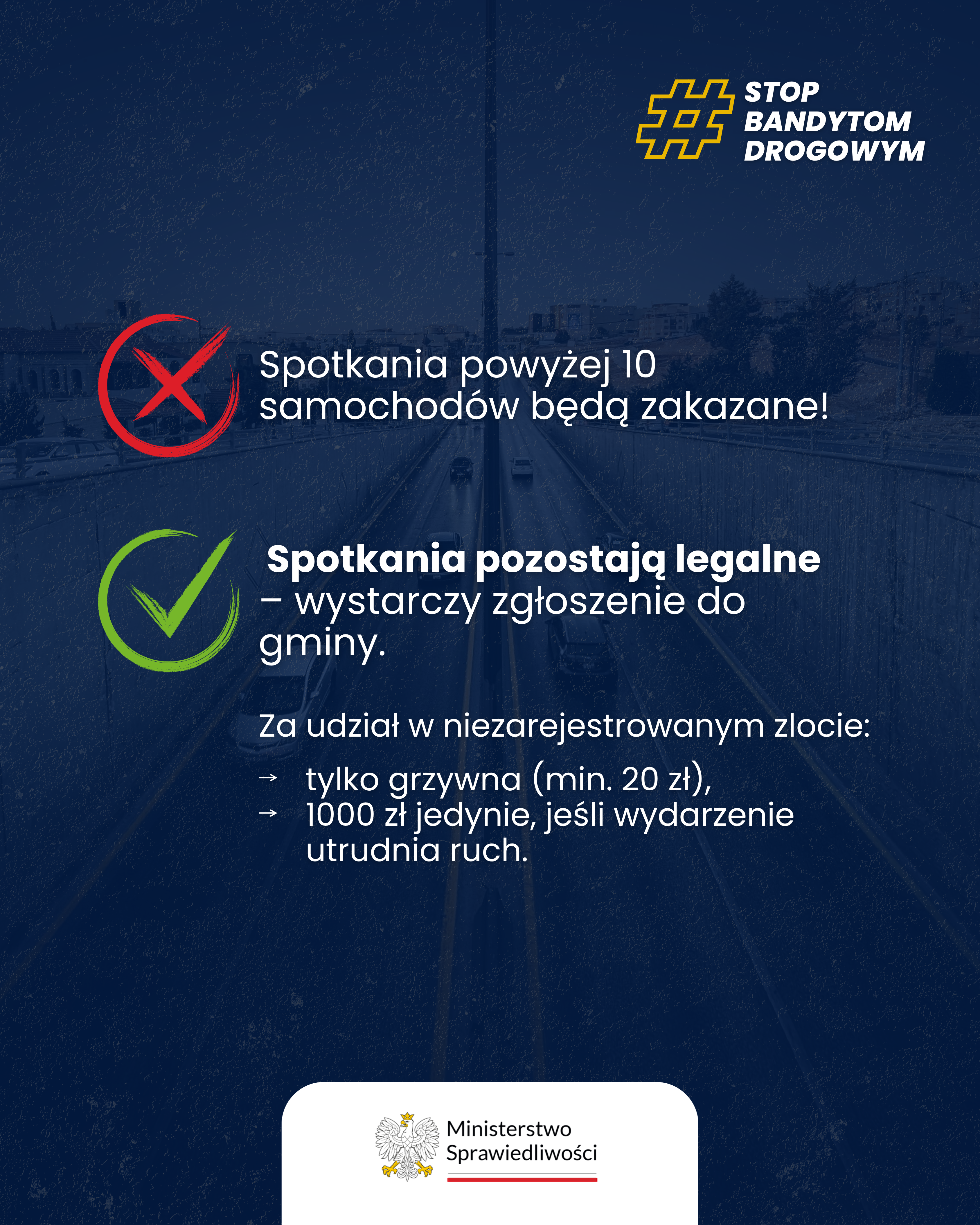 W odniesieniu do organizowania spotkań motoryzacyjnych Ministerstwo wyjaśnia, że spotkania powyżej 10 pojazdów wciąż będą legalne, o ile zostaną zgłoszone właściwej gminie. Udział w niezgłoszonym zgromadzeniu tego typu zagrożony jest wyłącznie minimalną karą grzywny (20 zł), chyba że wydarzenie powoduje tamowanie lub utrudnianie ruchu drogowego – wówczas grzywna może wynieść 1000 zł.