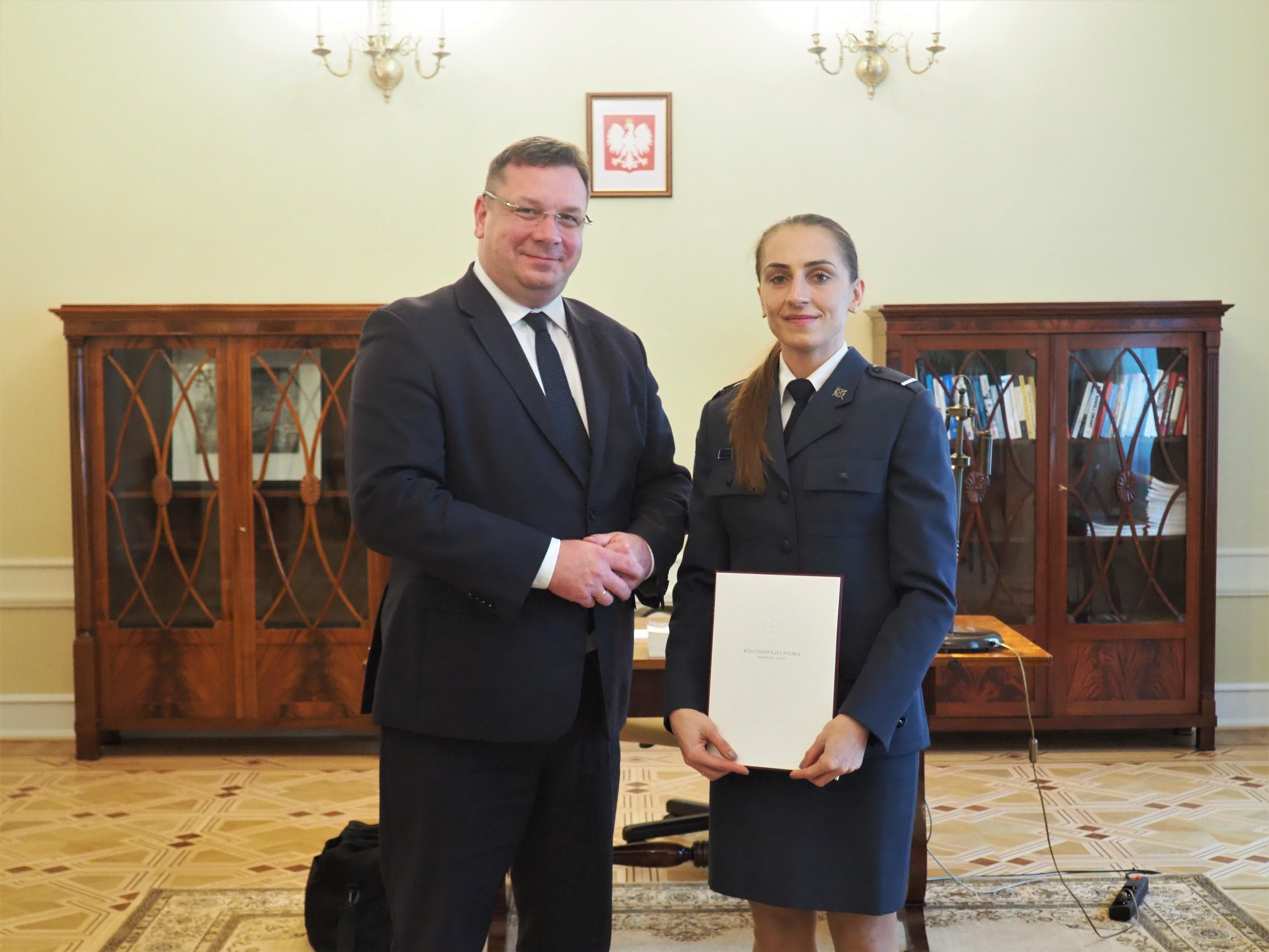 Wiceminister Sprawiedliwości Michał Wójcik nadzorujący więziennictwo wyróżnił st. szeregową Iwonę Nierodę–Zdziebko, funkcjonariuszkę z Zakładu Karnego w Rzeszowie za wyjątkowe zaangażowanie i wkład pracy w realizację zadań służbowych oraz trud w rozwijaniu wyjątkowej pasji - kickboxingu.