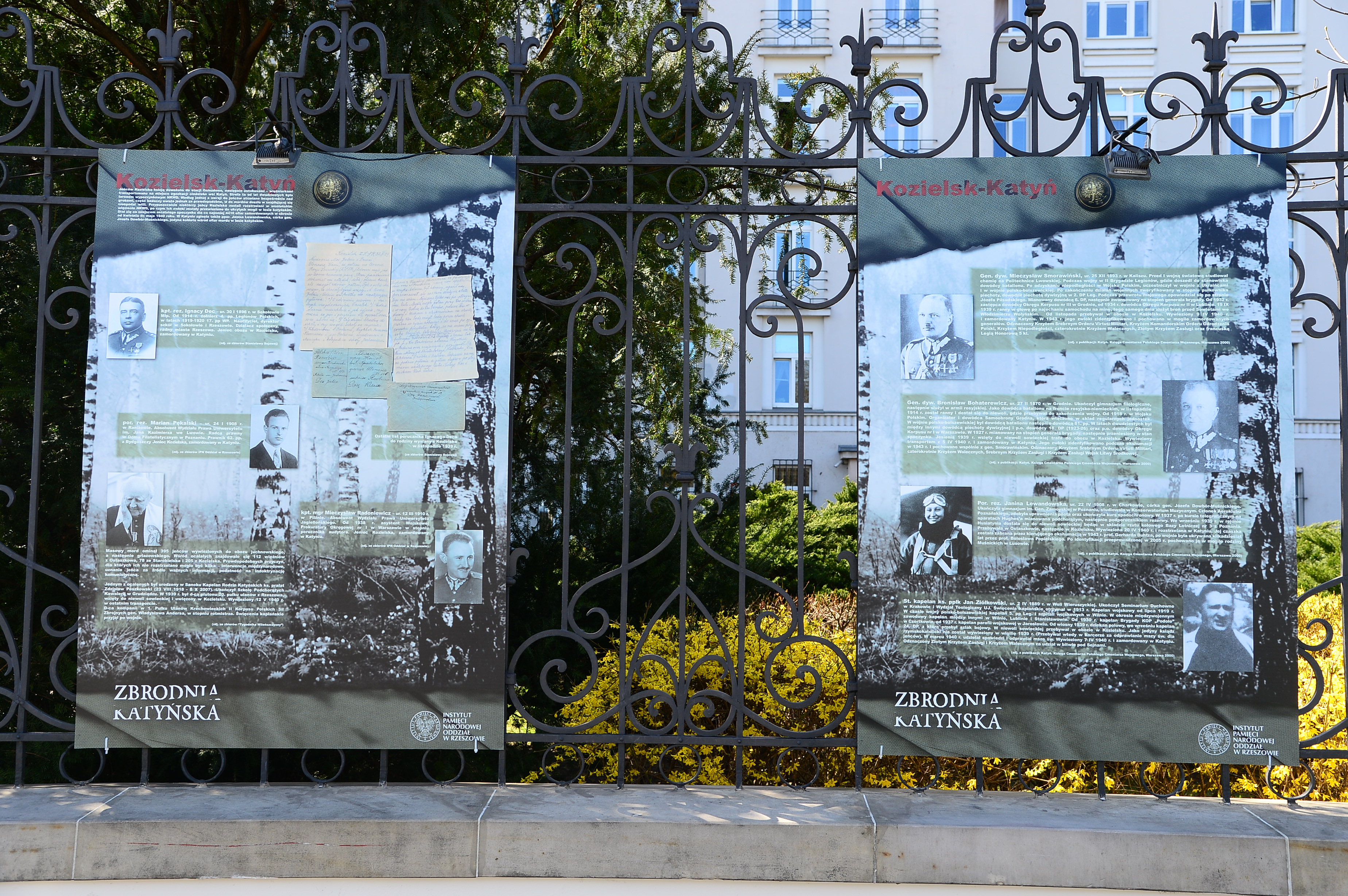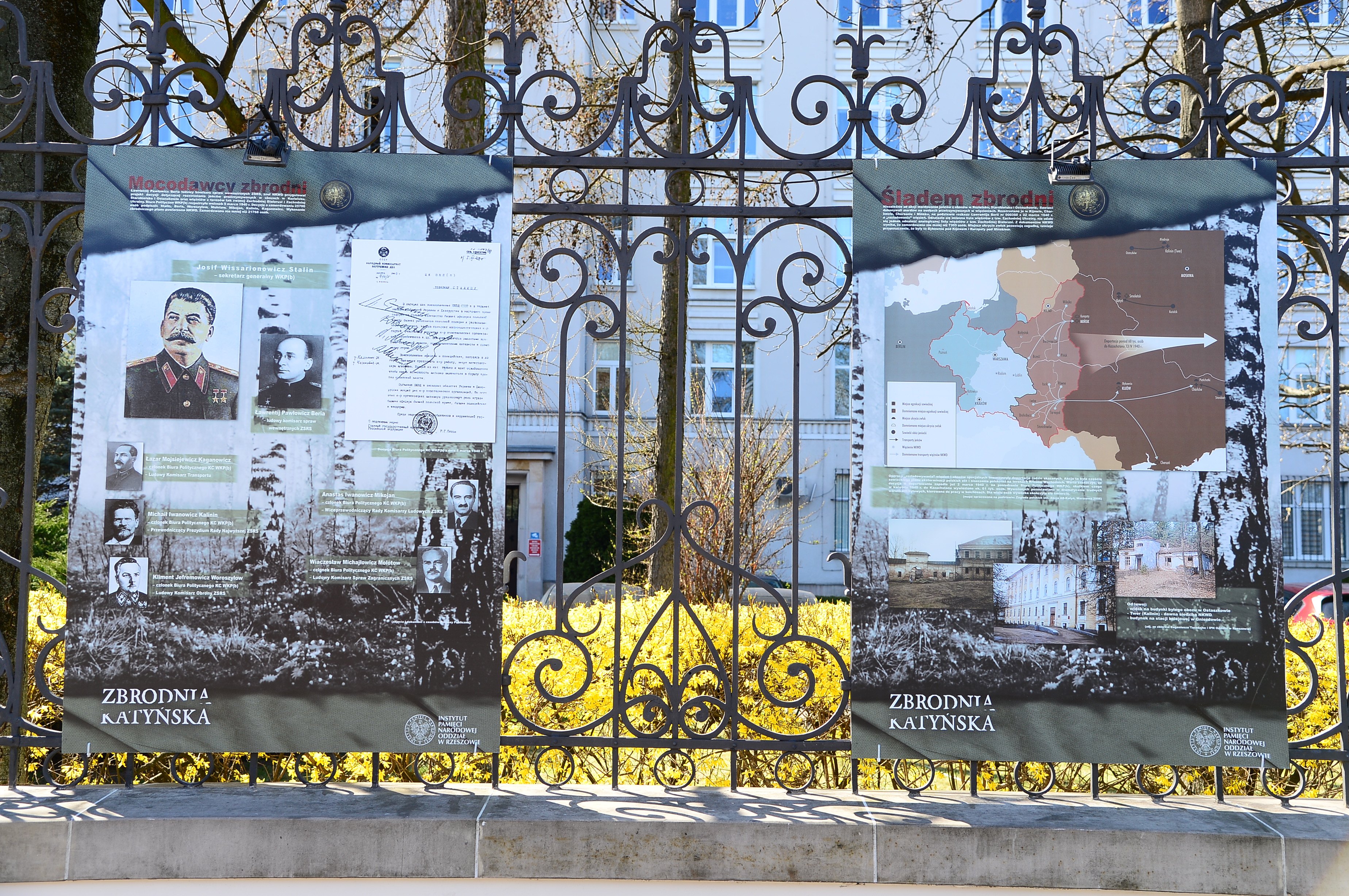 Na jednej z prezentowanych plansz zobaczymy twarze Stalina, Berii, Mołotowa oraz pozostałych mocodawców zbrodni, których podpisy widnieją pod decyzją Biura Politycznego Wszechzwiązkowej Komunistycznej Partii (bolszewików) z 5 marca 1940 r. o rozstrzelaniu jeńców przetrzymywanych w obozach w Kozielsku, Starobielsku i Ostaszkowie oraz polskich więźniów ze wschodnich terytoriów II Rzeczypospolitej.