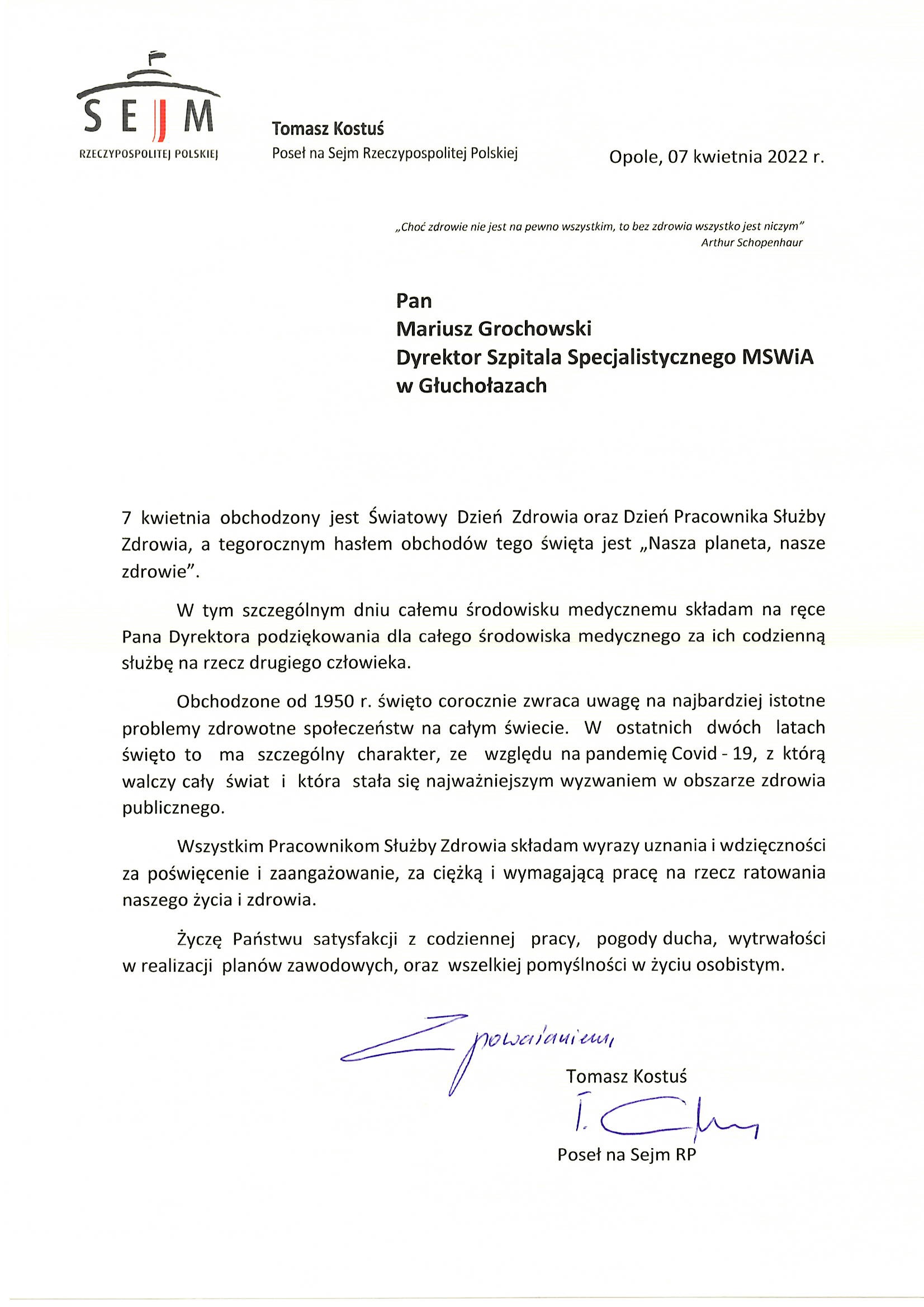 Na ręce dyrektora szpitala Mariusza Grochowskiego wpłynęły podziękowania Posła na Sejm RP Tomasza Kostusia dla całego środowiska medycznego za codzienną służbę na rzecz drugiego człowieka.