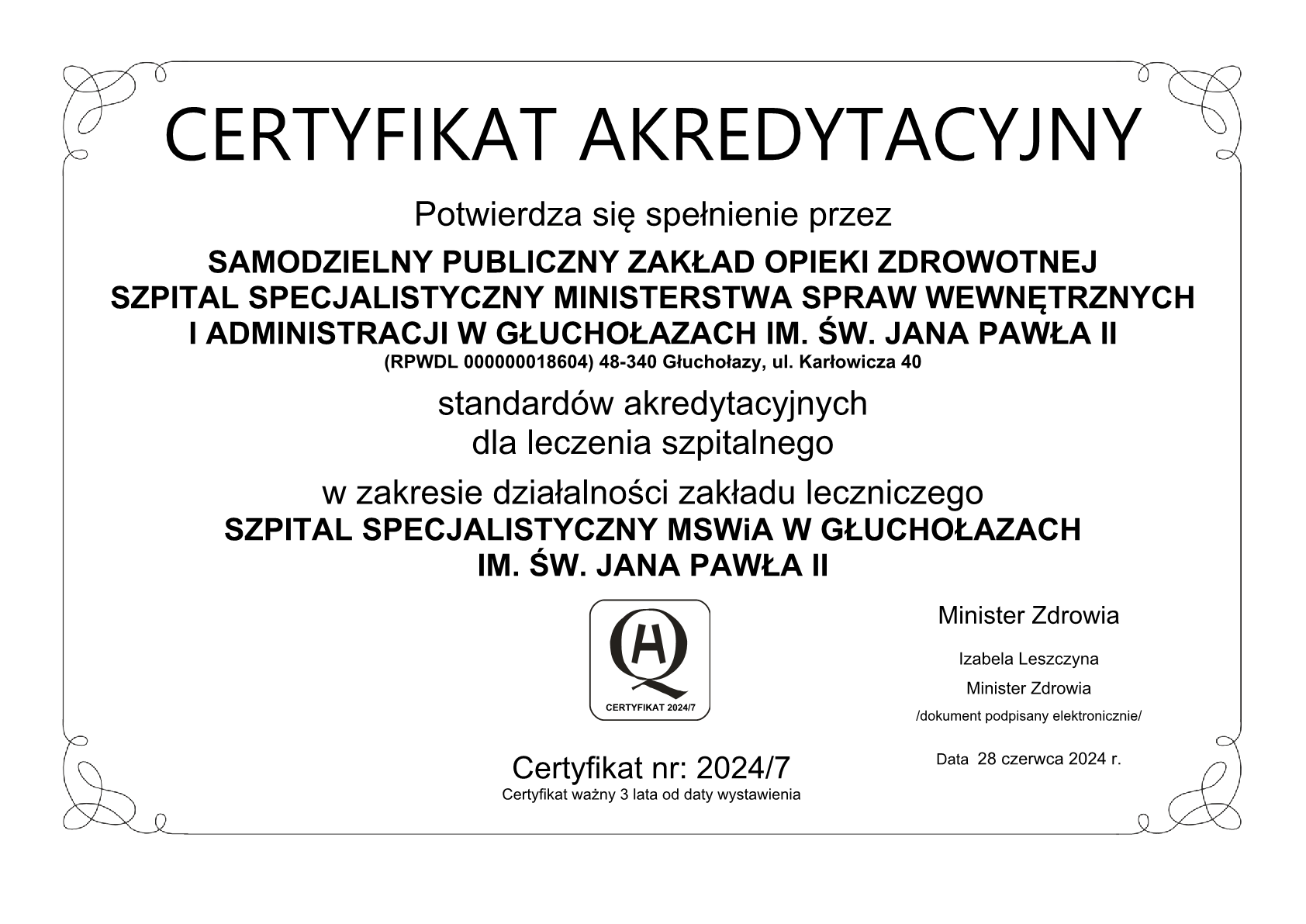 Certyfikat akredytacyjny Samodzielny Publiczny Zakład Opieki Zdrowotnej Szpital Specjalistyczny Ministerstwa Spraw Wewnętrznych i Administracji w Głuchołazach im. św. Jana Pawła II spełnia standardy akredytacyjne w zakresie lecznictwa szpitalnego.