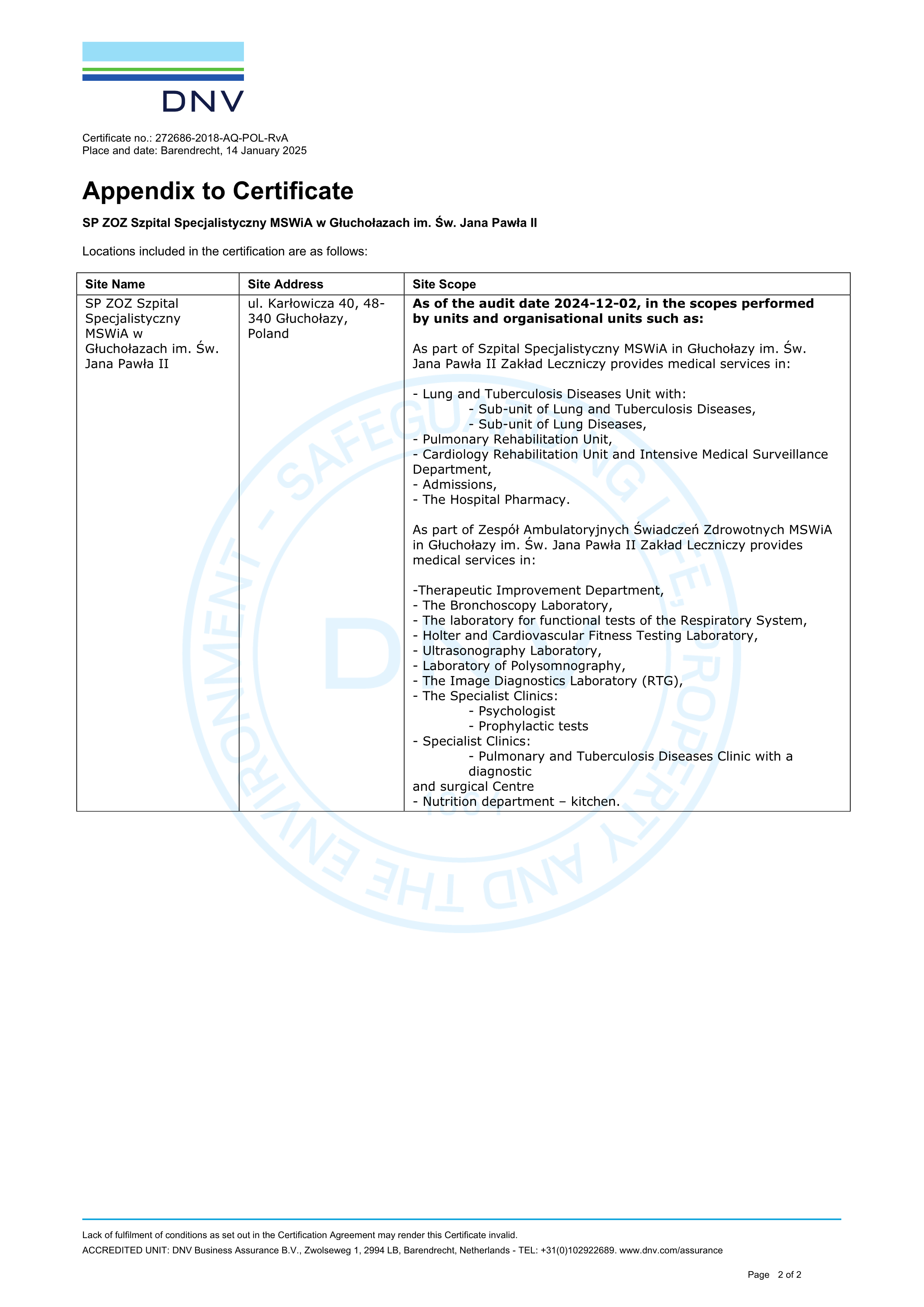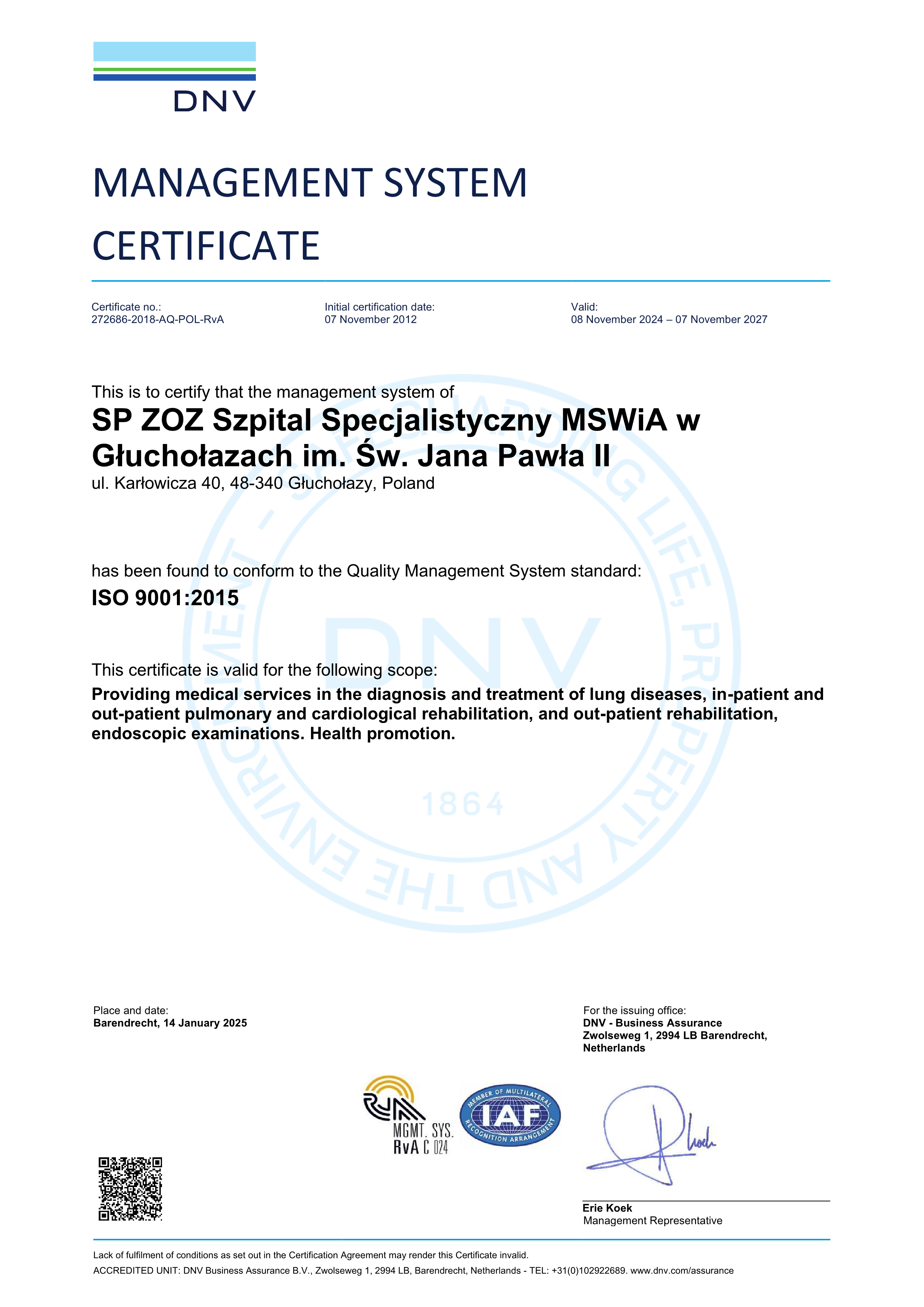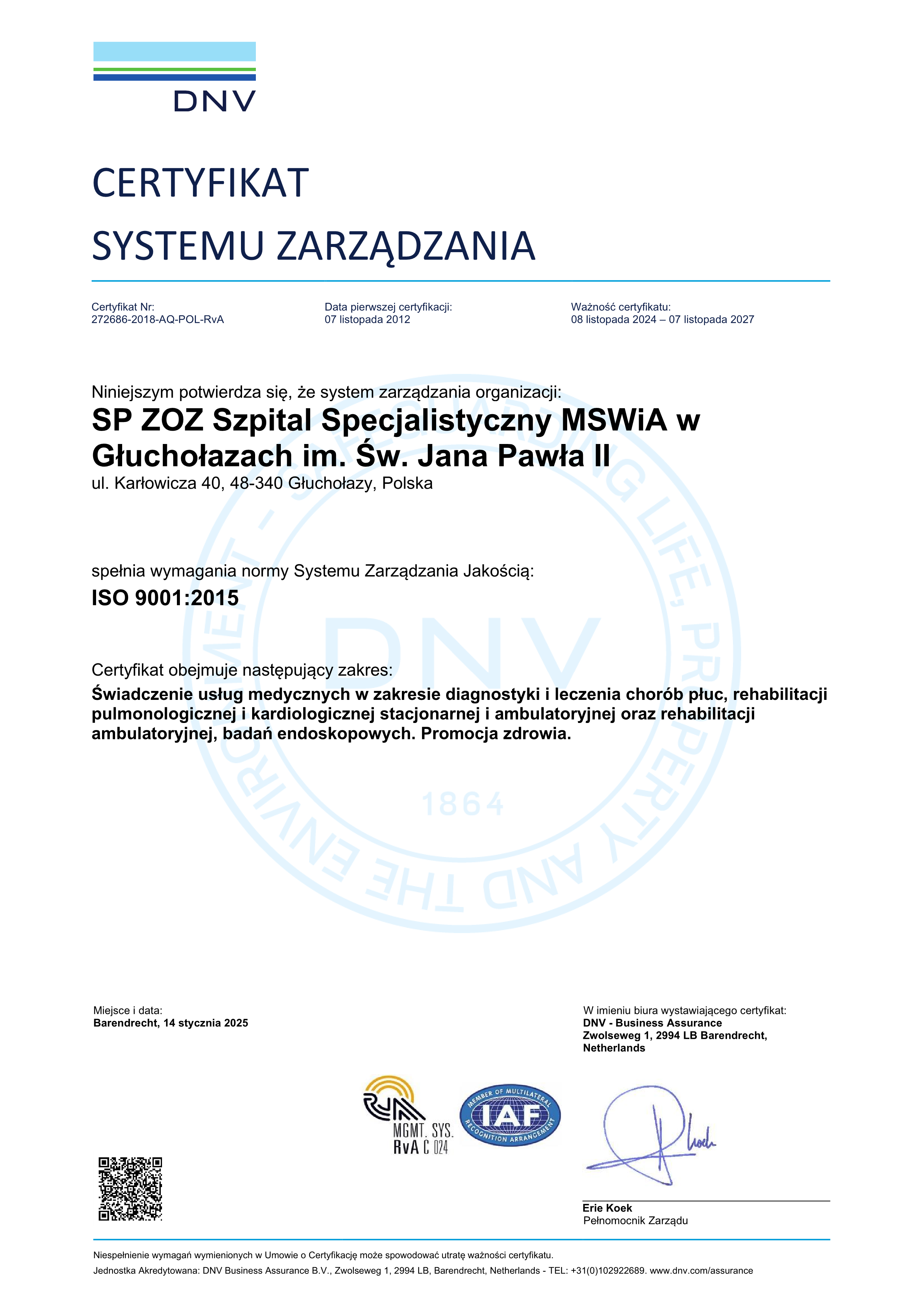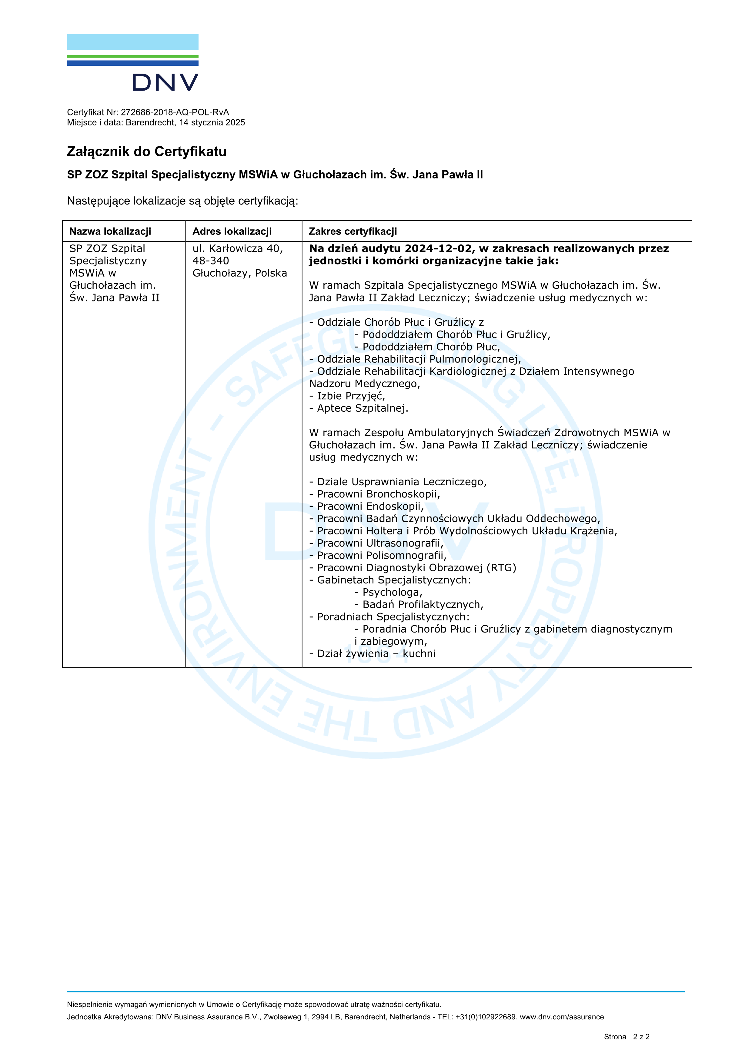 Samodzielny Publiczny Zakład Opieki Zdrowotnej Szpital Specjalistyczny Ministerstwa Spraw Wewnętrznych i Administracji w Głuchołazach im. św. Jana Pawła II spełnia wymagania normy Systemu Zarządzania Jakością ISO 9001:2015.