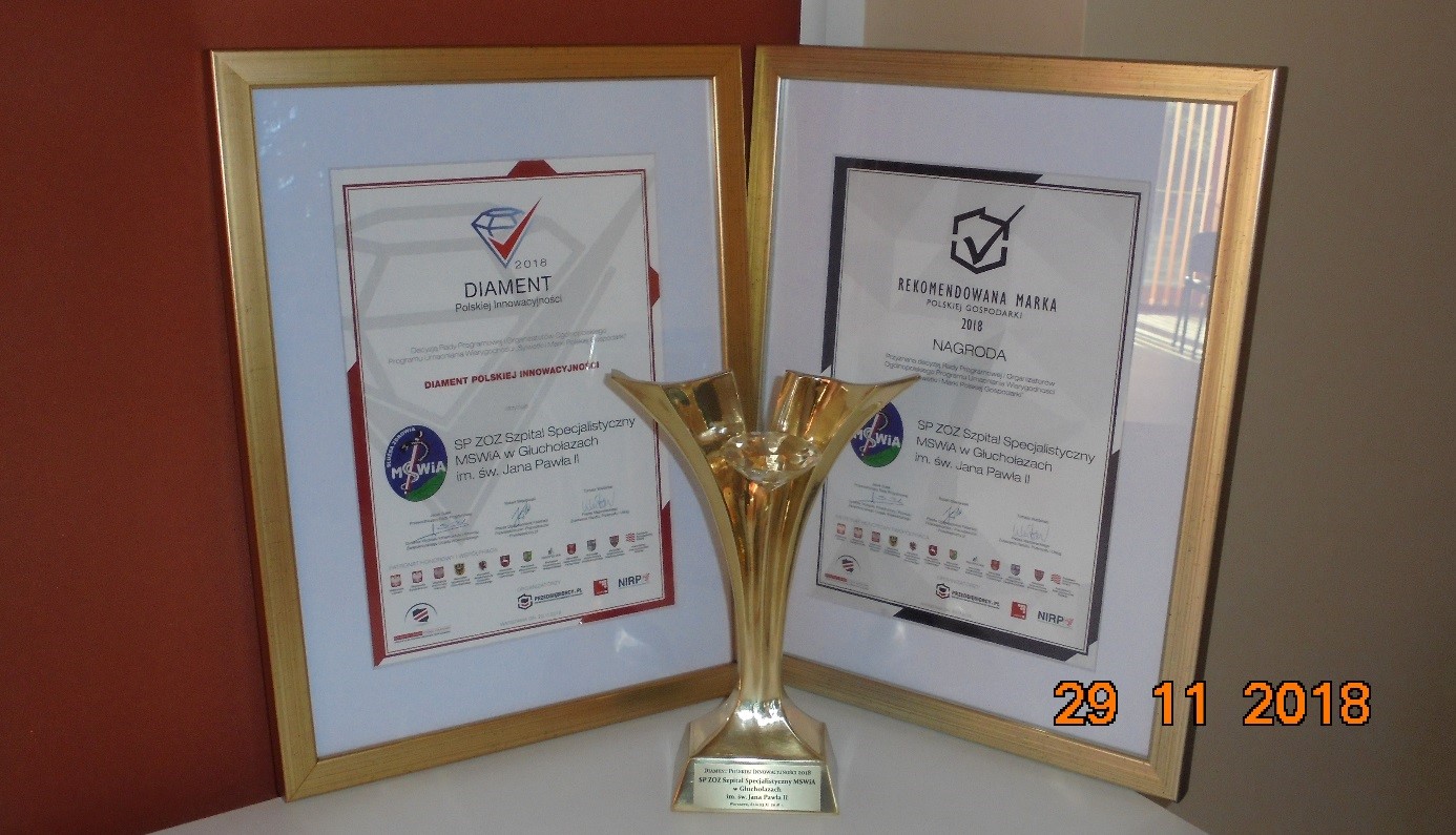 Szpital zdobył kolejną nagrodę „ Diament Innowacyjności 2018” w Programie „ Sylwetki i Marki Polskiej Gospodarki”. Program powstał z inicjatywy Ogólnopolskiej Federacji Przedsiębiorców i Pracodawców Przedsiębiorcy.pl, którego celem jest propagowanie i umacnianie etycznych norm oraz standardów w obszarach: przedsiębiorczości, instytucji jak również w ochronie zdrowia. W ramach Programu przyznawany jest tytuł „Rekomendowana Marka Polskiej Gospodarki”, oraz realizowane są Projekty: „Rzetelni”, „Liderzy Polskiej Gospodarki” oraz „Diamenty Polskiej Gospodarki.