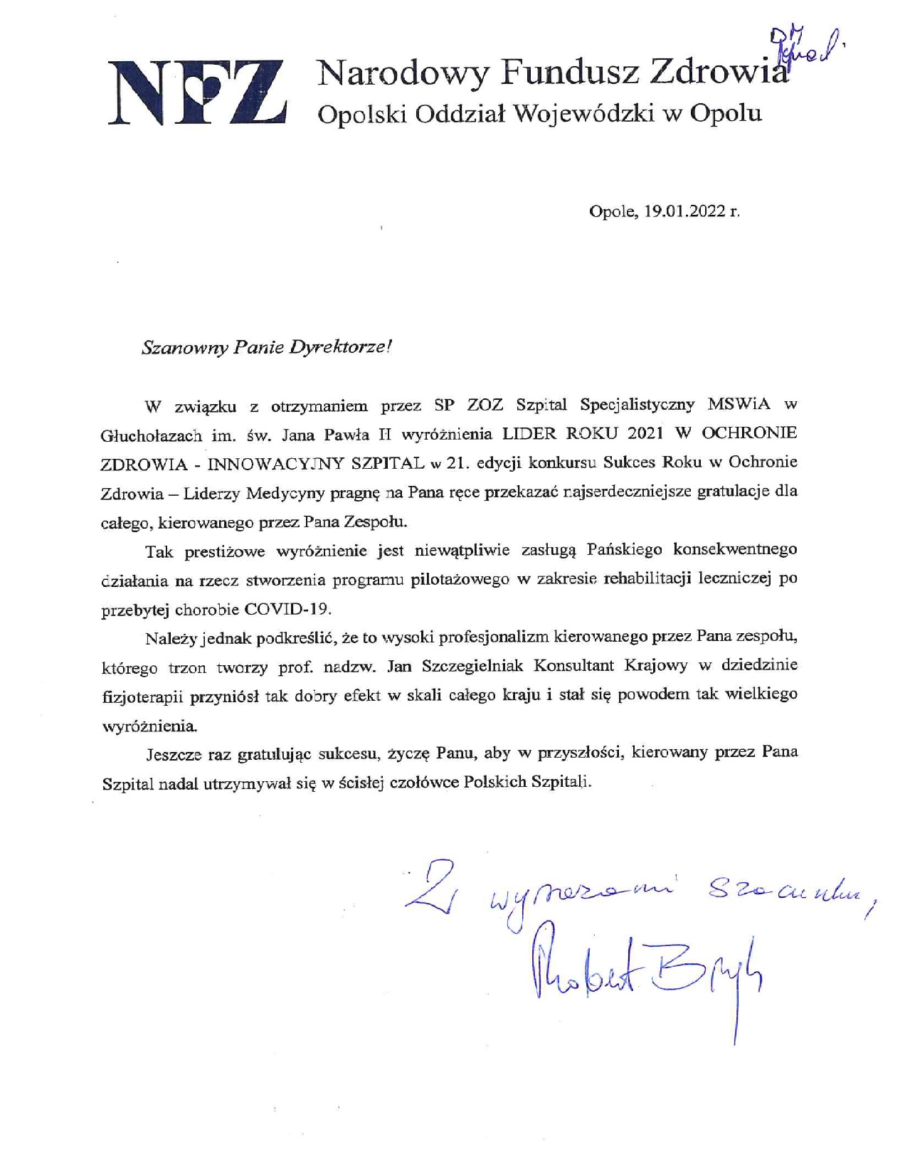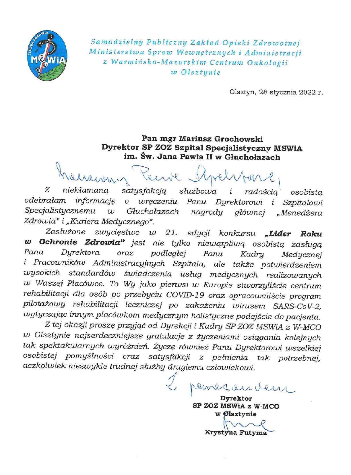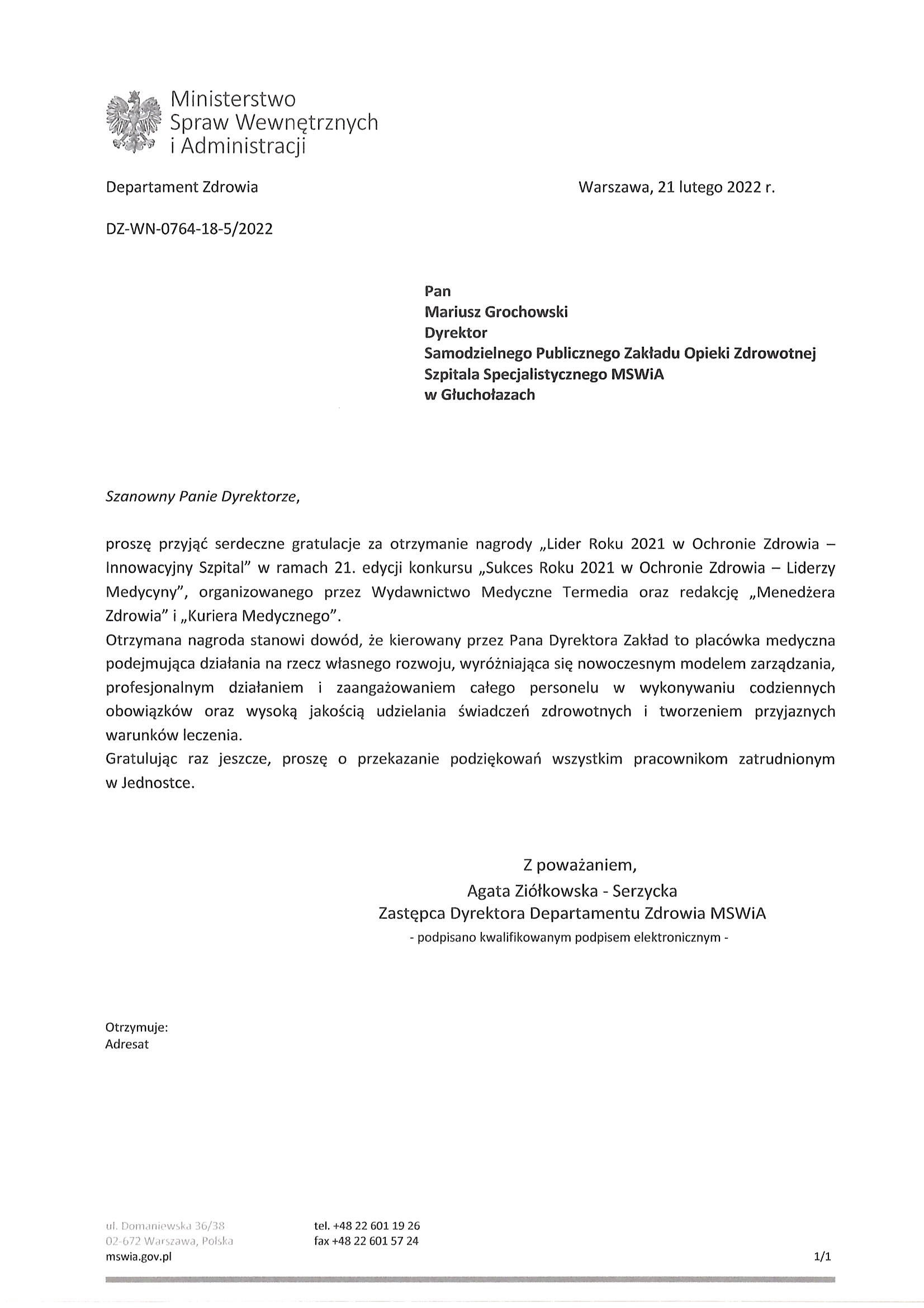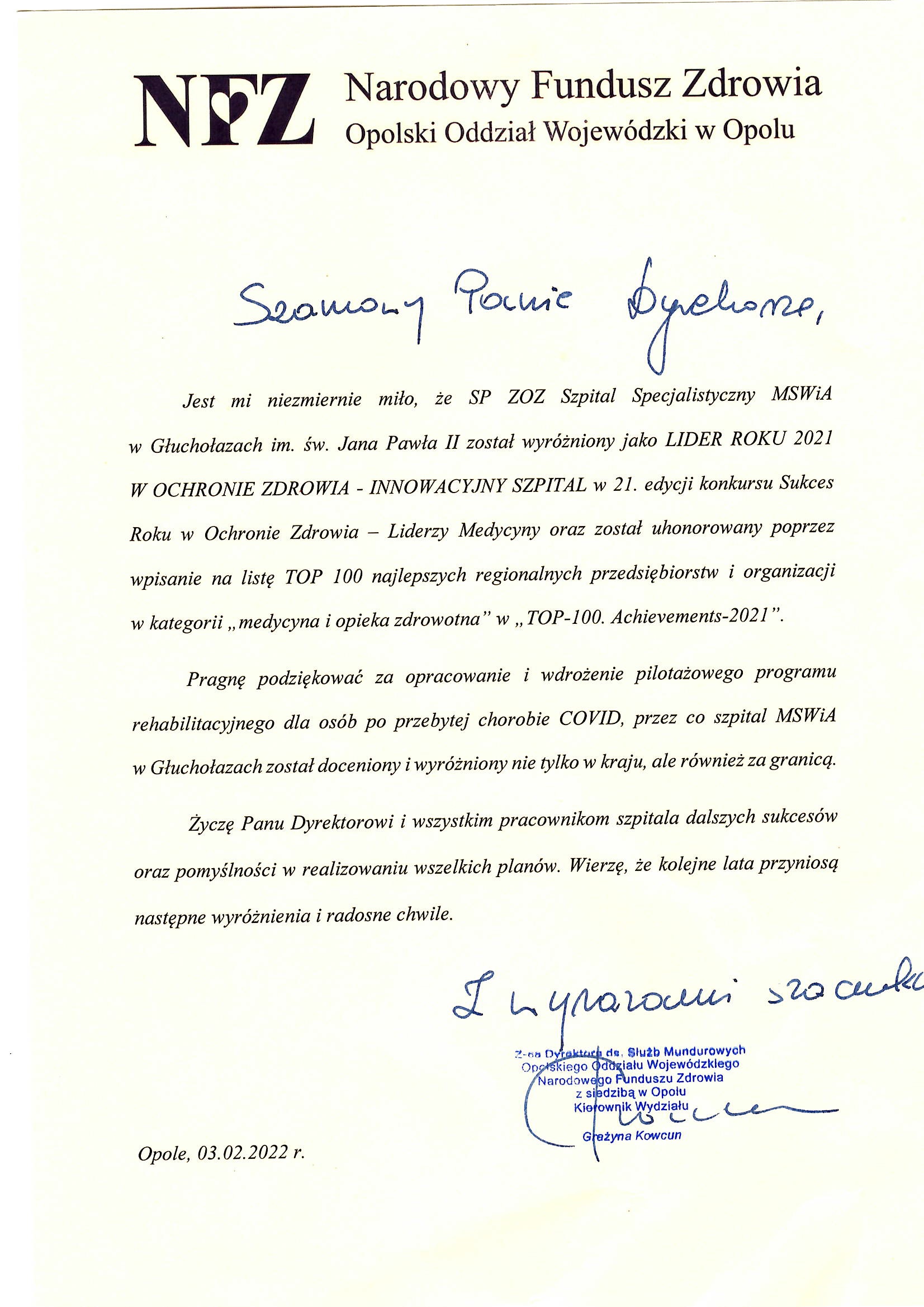 Nagroda: „Lider Roku 2021 w Ochronie Zdrowia – Innowacyjny Szpital” przyznana SP ZOZ Szpitalowi Specjalistycznemu MSWiA w Głuchołazach im. św. Jana Pawła II