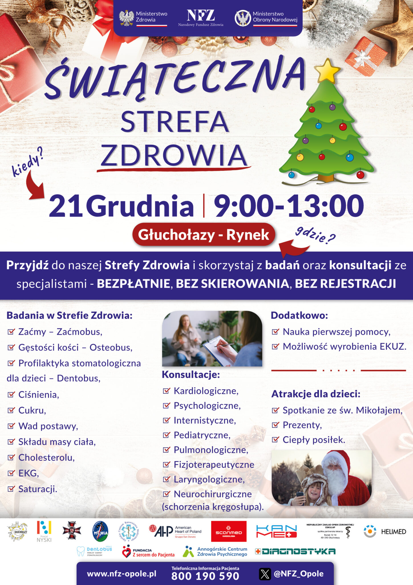 W dniu 21 grudnia 2024 roku na rynku w Głuchołazach odbyło się wyjątkowe wydarzenie – “Świąteczna Strefa Zdrowia”, zorganizowane przez Opolski Oddział Wojewódzki Narodowego Funduszu Zdrowia.