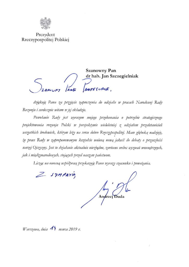 W dniu 14 marca br. Prezydent RP Andrzej Duda powołał do Narodowej Rady Rozwoju Prof. dr hab. Jana Szczegielniaka. Profesor Jan Szczegielniak dołączył do sekcji Ochrona zdrowia Narodowej Rady Rozwoju.