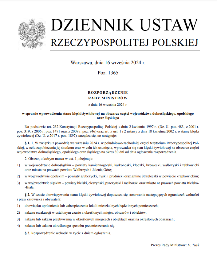 Rozporządzenie Rady Ministrów z dnia 16 września 2024 r. w sprawie wprowadzenia stanu klęski żywiołowej na obszarze części województwa dolnośląskiego, opolskiego oraz śląskiego