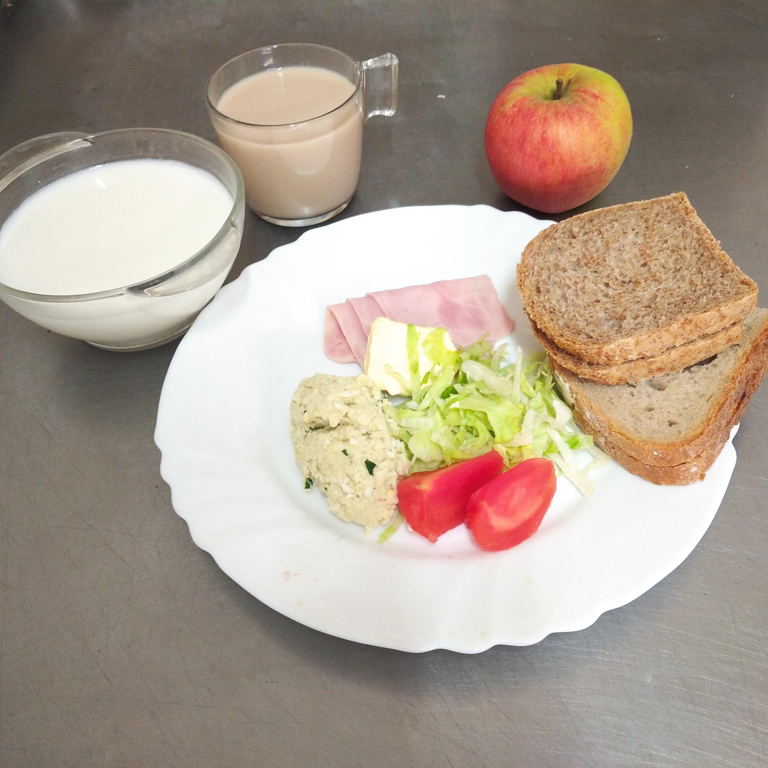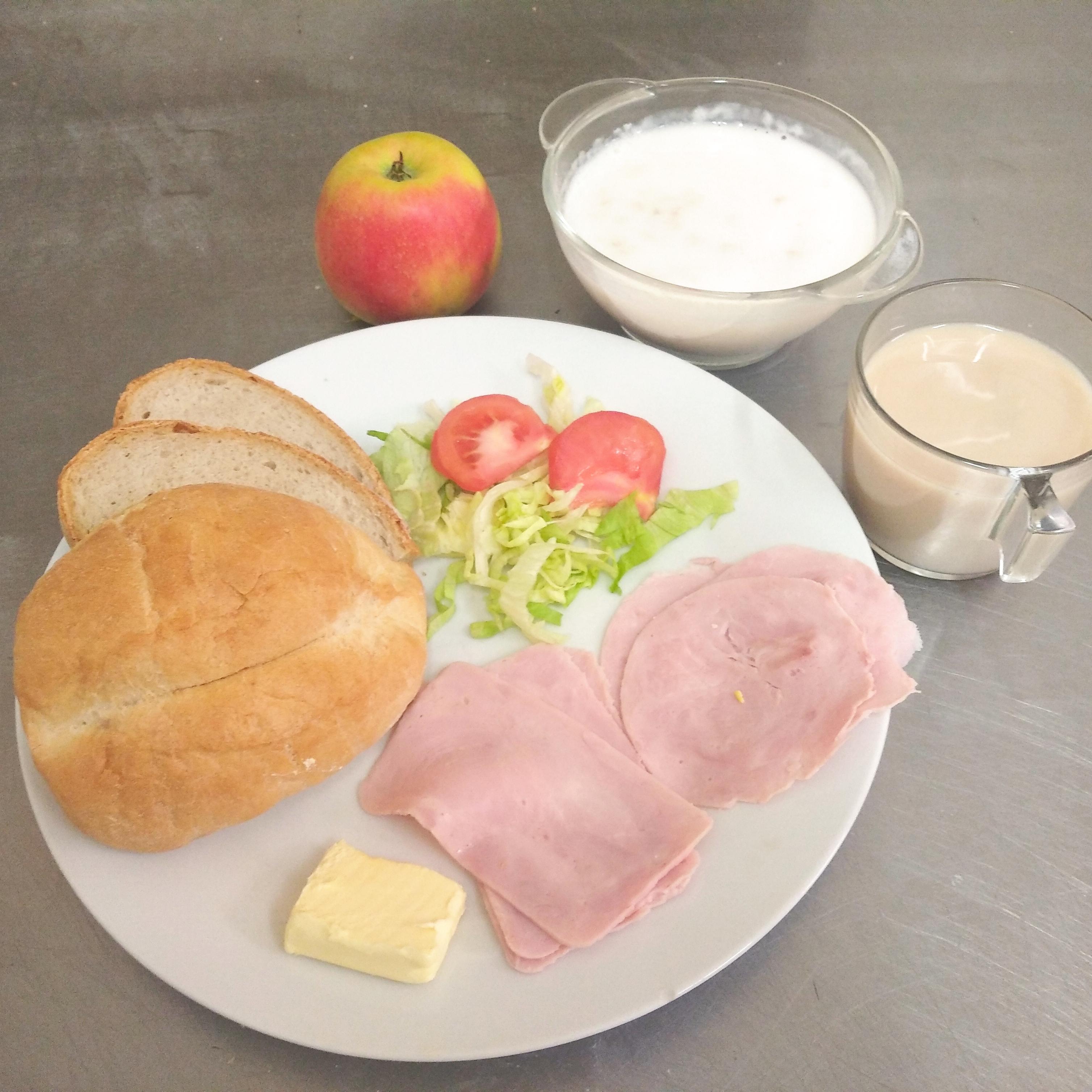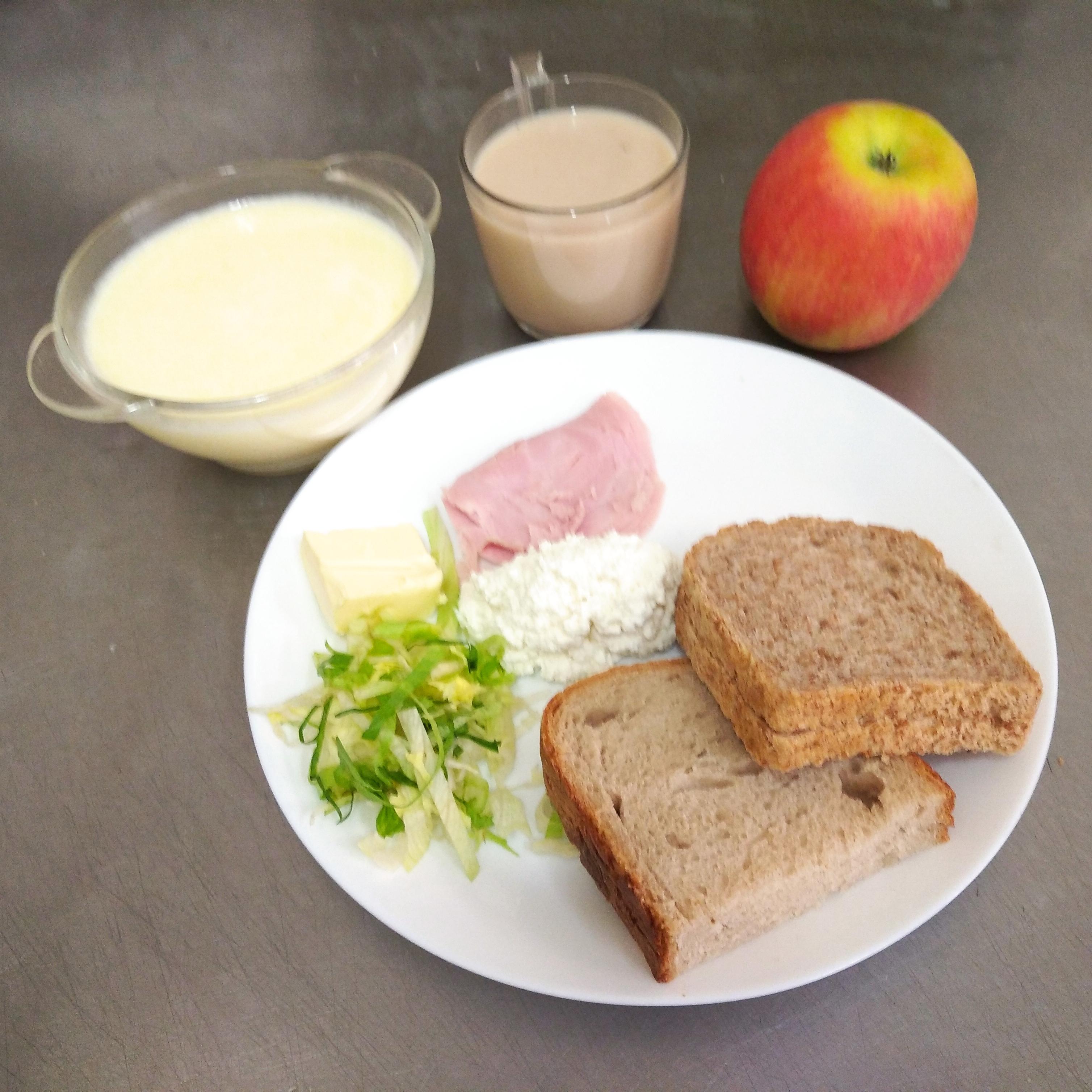 | kolacja | chleb 100g*GLU), masło 20g(MLE), szynkowa z indyka 40g(SOJ,GOR,GLU), ser topiony 14g(MLE), ogórek kiszony 40g, rzodkiewka 20g, sałata, herbata 200ml | chleb 100g(GLU), masło 20g(MLE), polędwica drobiowa 60g(SOJ,GOR,GLU), pomidor bez skórki, sałata, herbata 200ml | chleb 100g(GLU), masło 20g(MLE), herbata 200 ml, miód 25g dżem 25g | chleb graham 100g(GLU), masło 10g(MLE), herbata b/c 200ml, blok szynkowy 30g(GLU,SOJ,GOR), ser żółty 30g(MLE), ogórek zielony 30g, sałata, papryka 30g | ||