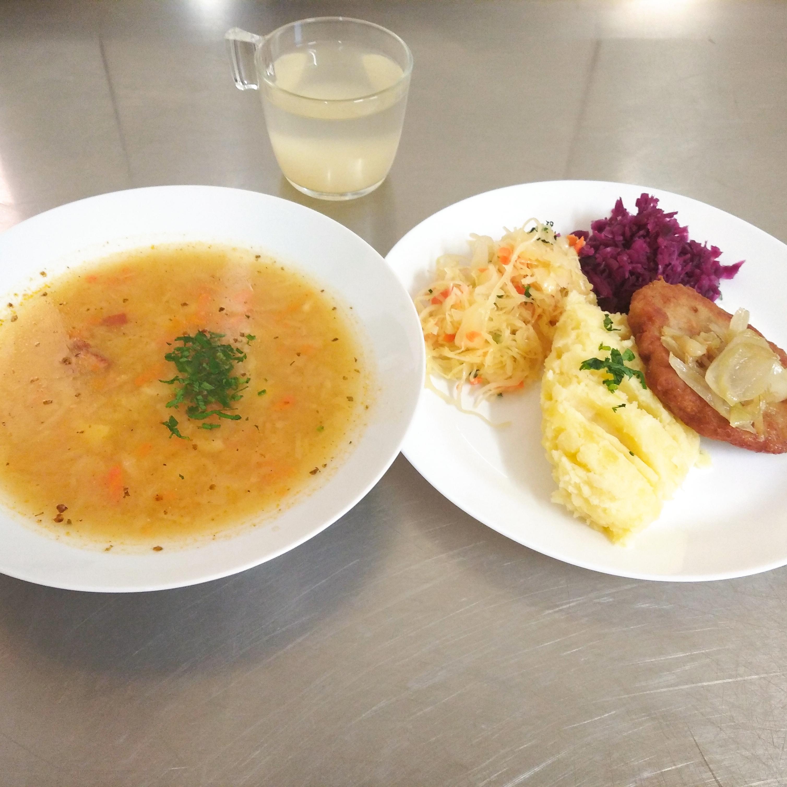 | obiad | kapuśniak 400ml(MLE,GLU,SEL), rumsztyk z cebulką 110g(JAJ,MLE,GLU), ziemniaki 200g, surówka z kap kiszonej 60g, sałatka z kapusty czerwonej 80g, kompot 200ml | zupa grysikowa 400ml(SEL,GLU), pulpet 110g w sosie pietruszkowym 150g(GLU,MLE), gotowane ziemniaki 200g, buraki 120g, kompot 200ml | zupa grysikowa 400ml(SEL,GLU), pulpet 110g w sosie pietruszkowym 150g(GLU,MLE), gotowane ziemniaki 200g, buraki 120g, kompot 200ml | zupa grysikowa 350ml(SEL,GLU) pulpet 110g, ziemniaki 200g surówka z kapusty białej 80g, buraki 80g woda 200ml, | ||