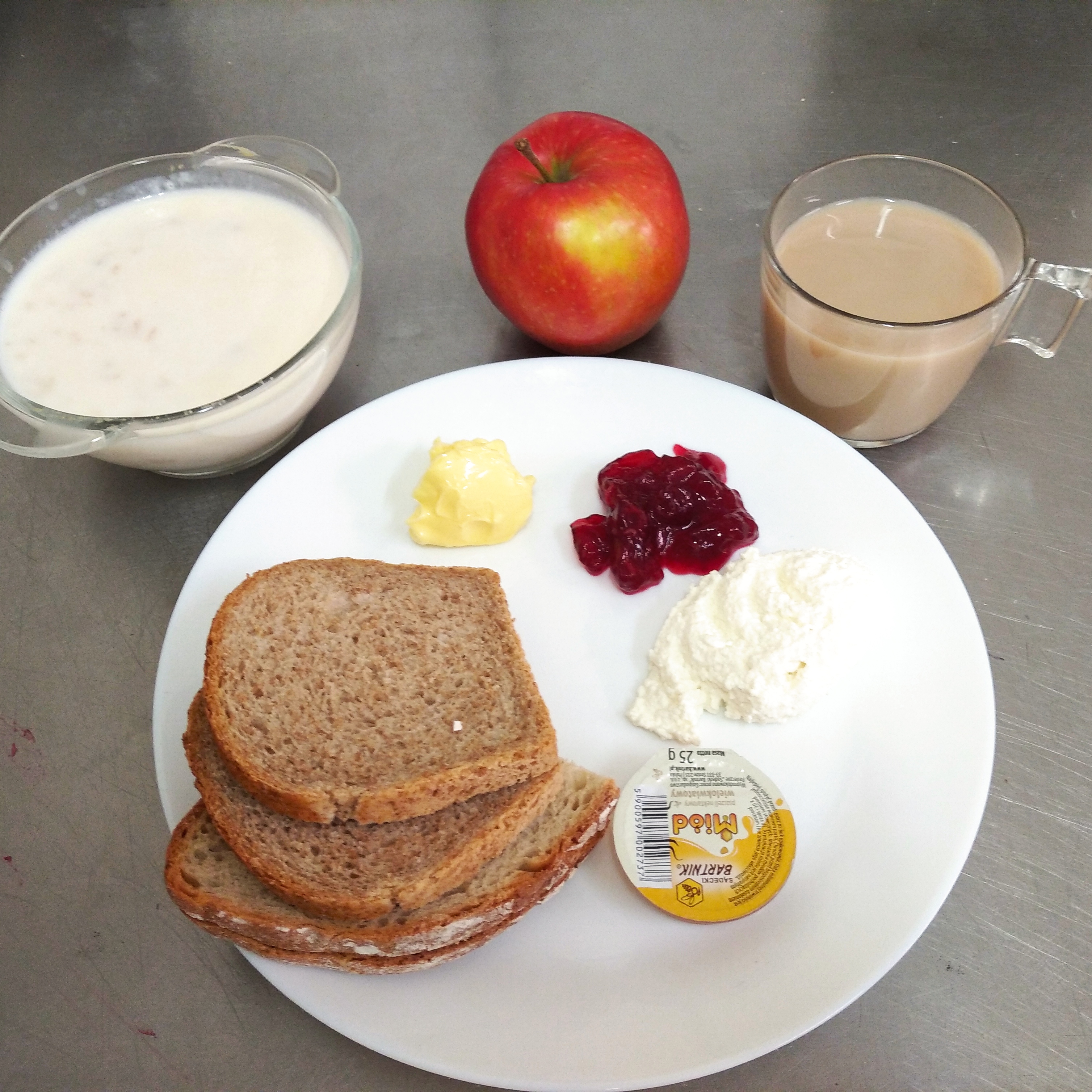 | 11.01.2024 | śniadanie | zupa mleczna z płatkami owsianymi 300ml, chleb 150g, masło 20g, ser biały 50g, miód 25g, dżem 25g, śliwki, kawa biała 200ml | zupa mleczna z płatkami owsianymi 300ml, chleb/bułka 150g, masło 20g, kawa biała 200ml, ser biały 50g, miód 25g, jabłko | zupa mleczna z płatkami owsianymi 300ml, chleb/bułka 150g, masło 20g, kawa biała 200ml, ser biały 50g, miód 25g, jabłko | chleb graham100g, masło 10g, ser żółty 30g polędwica drobiowa 30g, sałata, ogórek zielony 30g,rzodkiewki 20g, śliwki, jogurt naturalny 150ml,kawa biała 200ml | |||||