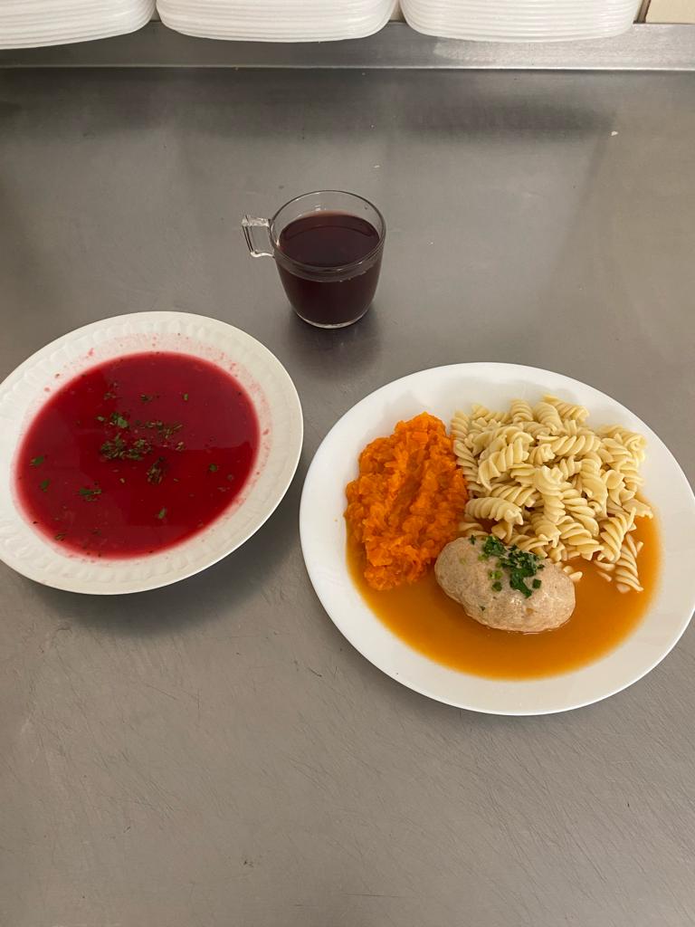 | obiad | Barszcz czerwony 400ml, gotowane pulpety w sosie pomidorowym 110/150g, z makaronem 200g surówka z białej kapusty120, kompot 200ml | Barszcz czerwony 400ml, gotowane pulpety w sosie pomidorowym 110/150g, z makaronem 200g marchewka120, kompot 200ml | Barszcz czerwony 400ml, gotowane pulpety w sosie pomidorowym 110/150g, z makaronem 200g marchewka120, kompot 200ml | Barszcz czerwony 400ml, gotowane pulpety w sosie pomidorowym 110/150g, surówka z kapusty białej 100g, marchewka 80g, woda 200ml | ||||||