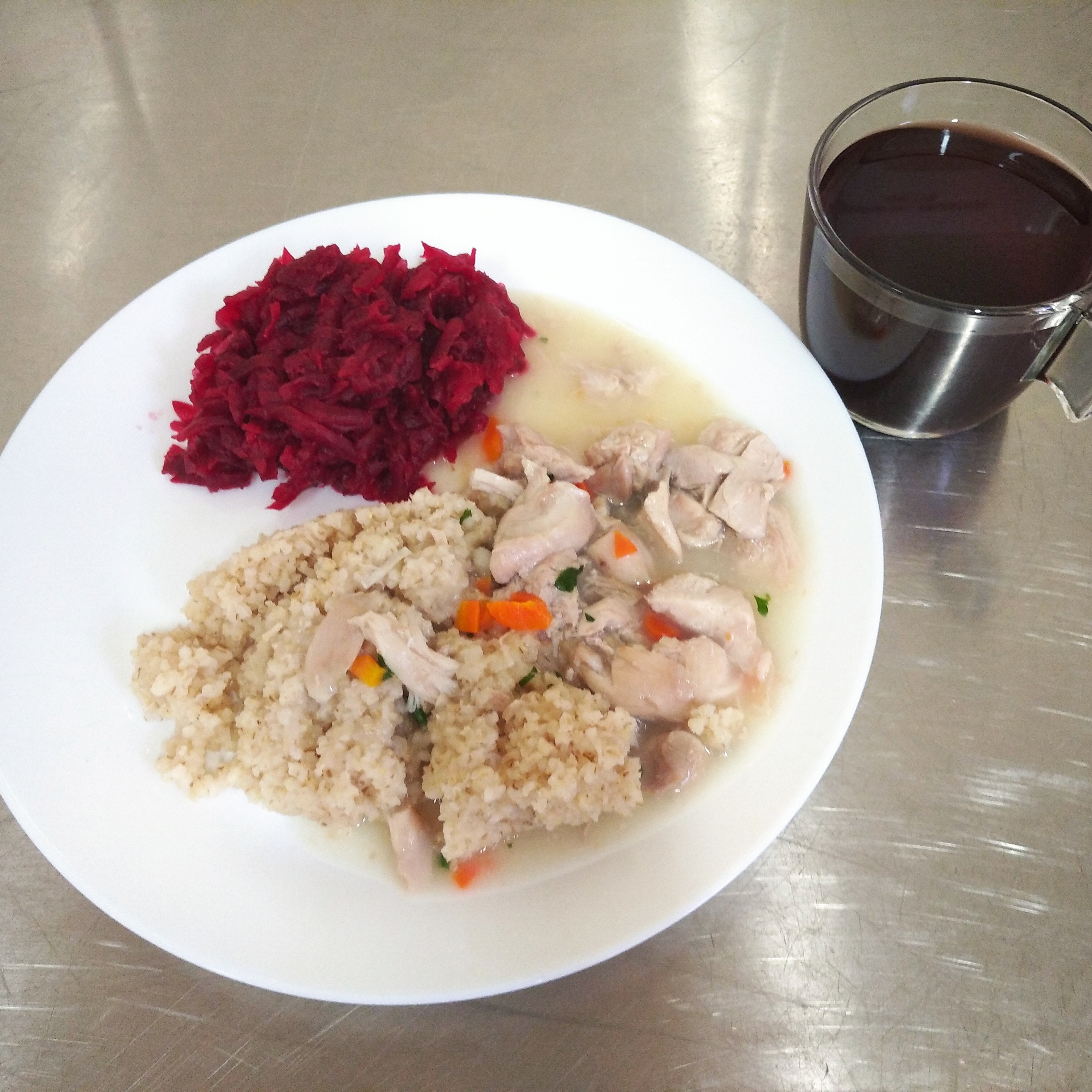 | obiad | zupa pomidorowa z makaronem 400ml, gulasz wieprzowy150g, kasza pęczak 200g, buraczki 120g, kompot 200ml | zupa pomidorowa z makaronem 400ml, potrawka drobiowa 150g z jęczmienną 200g, buraczki 120g, kompot 200ml | zupa pomidorowa z makaronem 350 ml, potrawka drobiowa 150g z kaszą jęczmienną 200g, buraki 100g, surówka z kapusty kiszonej 100g , woda 200ml | ||||||