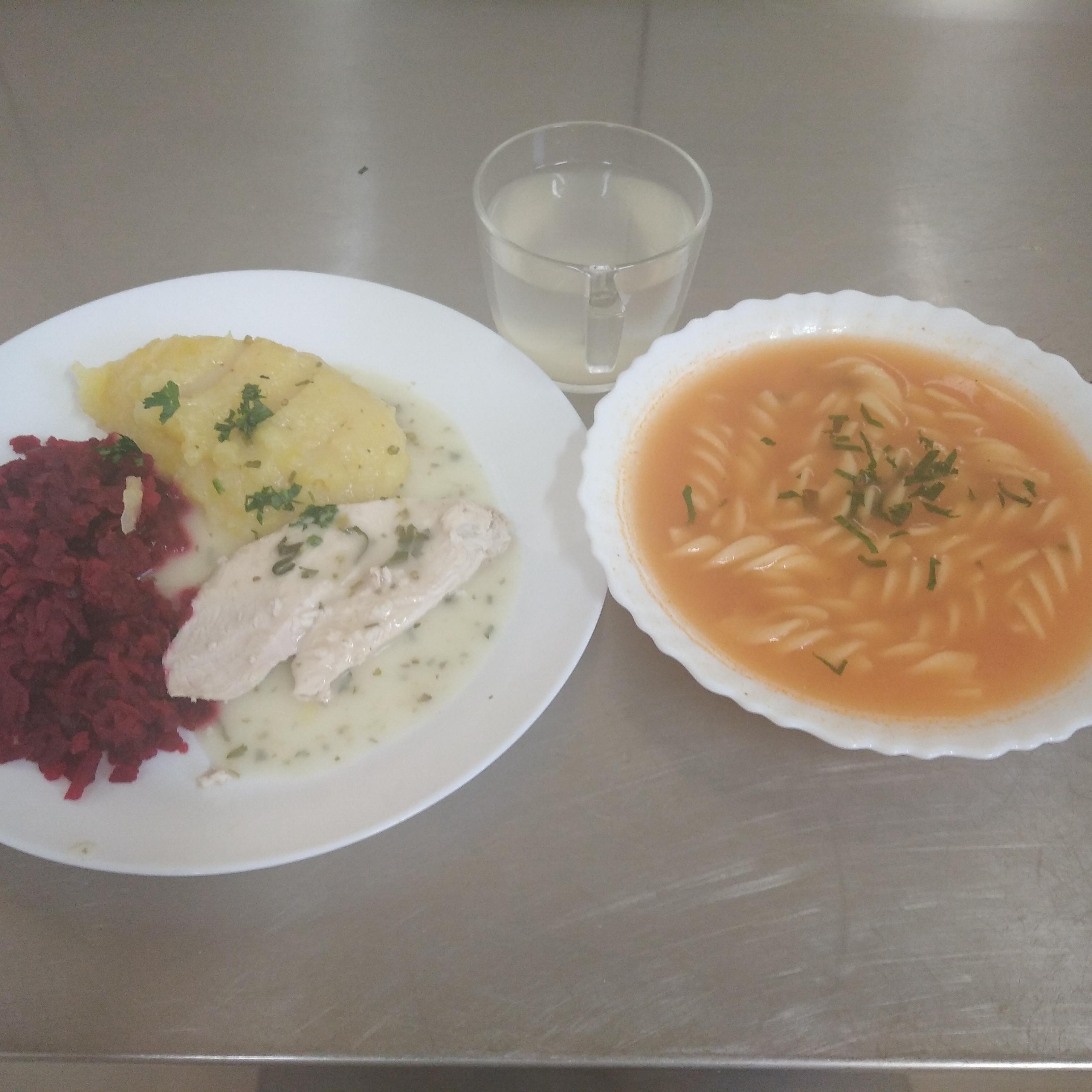 | obiad | zupa pomidorowa z makaronem 400ml(MLE,GLU, SEL), kotlet z piersi kurczaka 110g(GLU,MLE, , ziemniaki 200g, surówka z kapusty kiszonej 80g, sałatka z kapusty czerwonej 80g, kompot 200ml | zupa pomidorowa z makaronem 400ml(GLU,SEL,MLE), gotowany filet 110g w sosie pietruszkowym 150g(GLU,MLE), gotowane ziemniaki 200g, buraki 120g, kompot 200ml | zupa pomidorowa z makaronem 400ml(SEL,GLU,MLE), gotowany filet 110g w sosie pietruszkowym 150g(GLU,MLE), gotowane ziemniaki 200g, buraki 120g, kompot 200ml | zupa pomidorowa z makaronem 350ml(SEL,GLU,MLE) gotowany filet 110g, ziemniaki 200g surówka z kapusty białej 80g, buraki 80g woda 200ml | ||||
