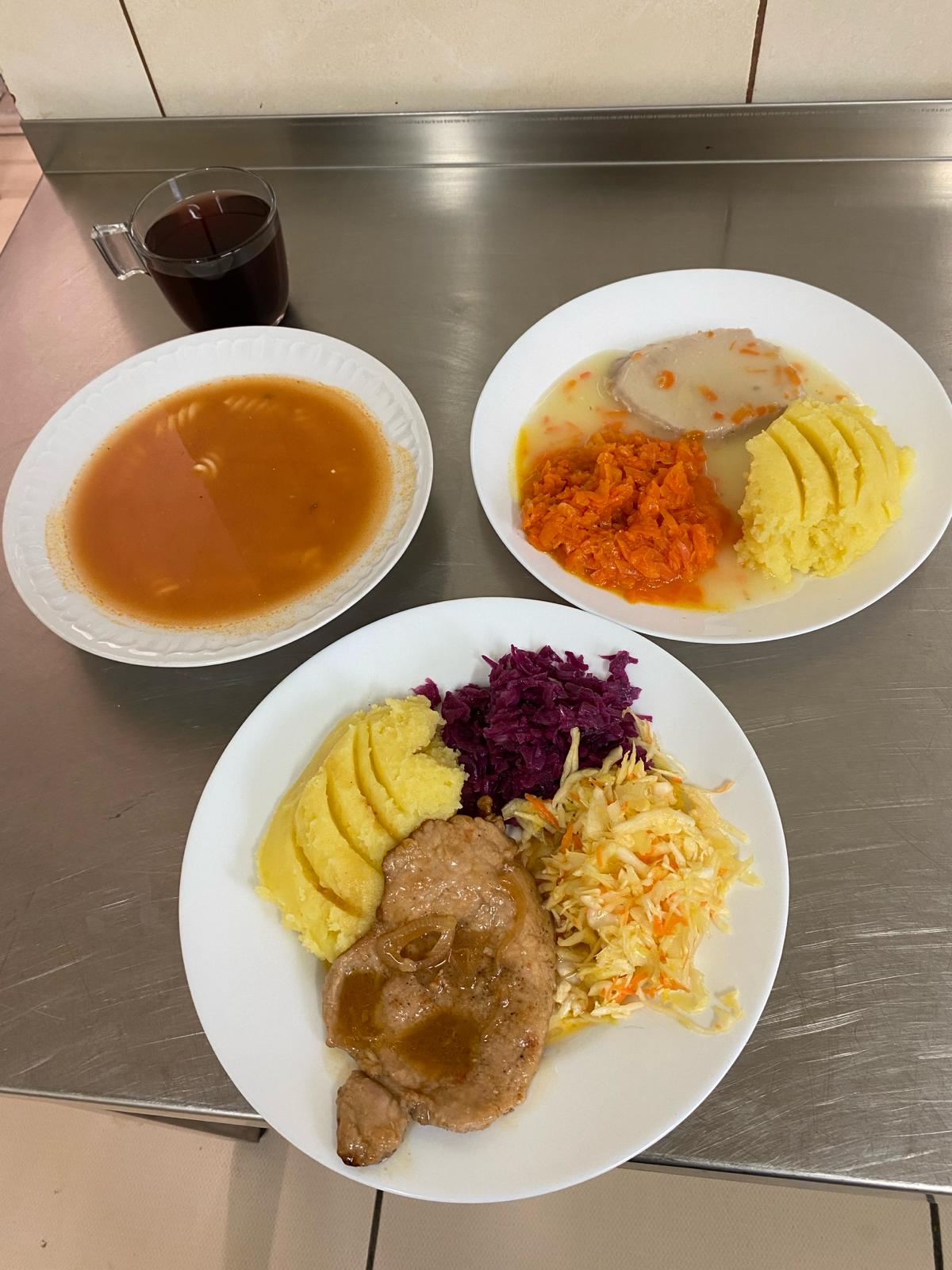 | obiad | zupa pomidorowa z makaronem nitki 400ml, bitki wieprzowe ze schabu 150g, ziemniaki 200g, surówka z kap białej 80g, sałatka z kapusty czerwonej 80g, kompot 200ml | zupa pomidorowa z makaronem nitki 400ml, schab gotowany w sosie własnym 110g, ziemniaki 200g, gotowana marchewka 150g, kompot 200ml | zupa pomidorowa z makaronem nitki 350 ml, schab gotowany w sosie własnym 110g, ziemniaki 200g, surówka z kapusty białej 80g, surówka z marchewki 80g, woda 200ml, jogurt naturalny 150ml | ||||
