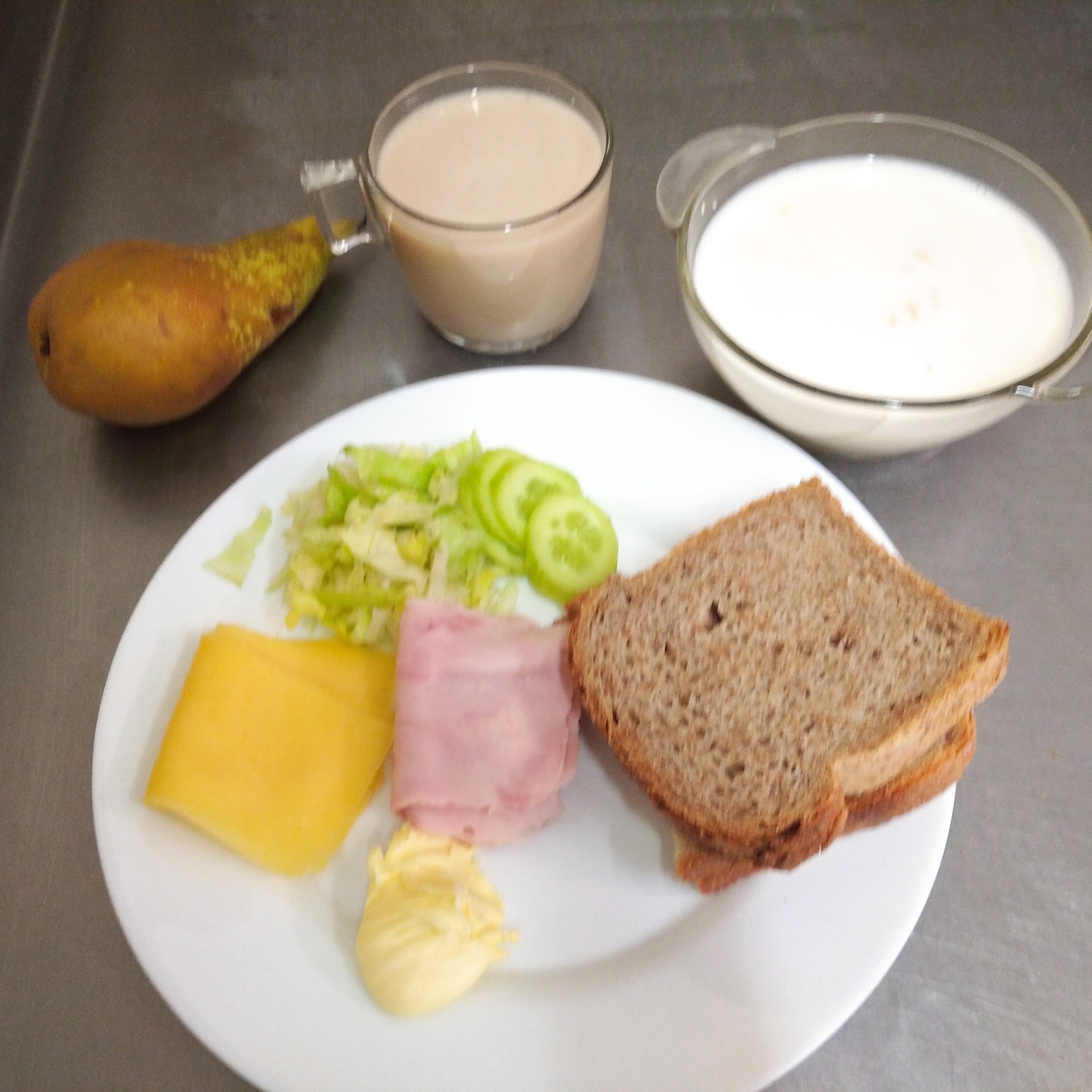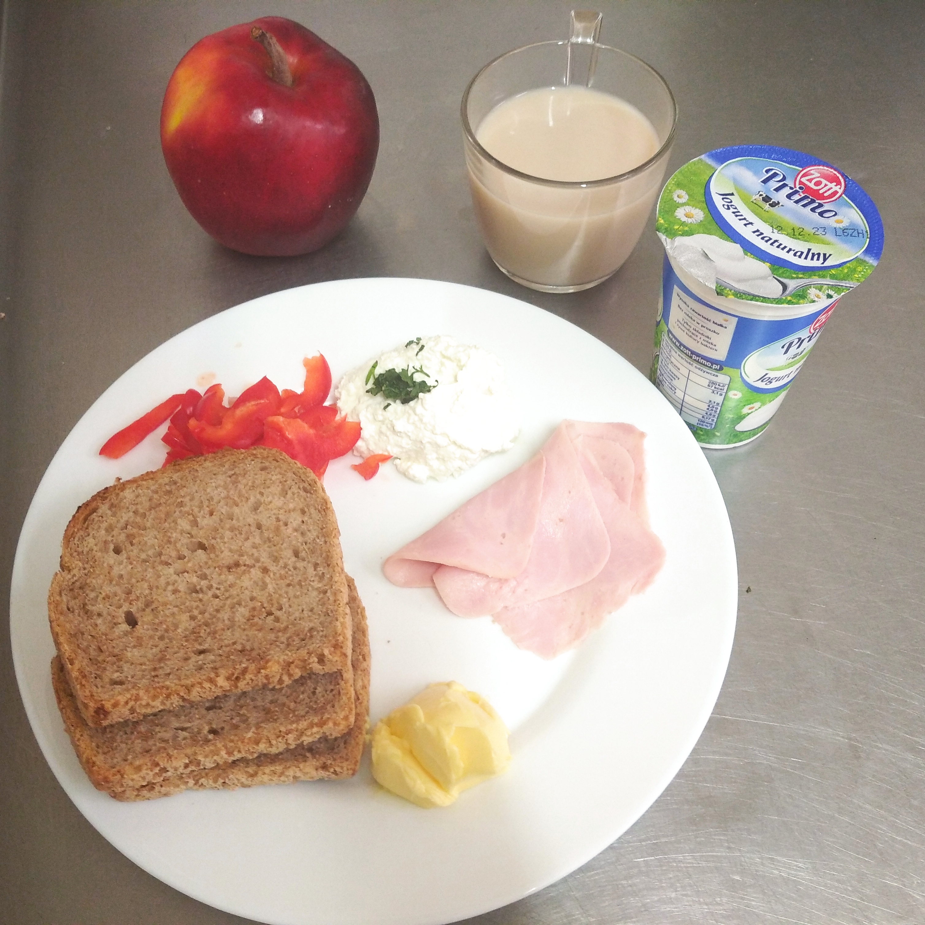 | 30.11 | śniadanie | zupa mleczna z kaszą kukurydzianą 300ml, chleb graham 150,g masło 20g, kawa biała 200ml, polędwica drobiowa 30g pasta jajeczna 25g, sałata, papryka 30g, gruszka | zupa mleczna z kaszą kukurydzianą 300ml, chleb/ bułka150g, masło 20g, kawa biała 200ml, polędwica drobiowa 60g, sałata, jabłko niskosodowa - pasta mięsna 50g sałata, jabłko | chleb graham 100g, masło 10g, kawa biała b/c 200ml, gotowane jajko 25g, polędwica drobiowa 30g, sałata, papryka 30g jogurt naturalny 150ml, jabłko | |||