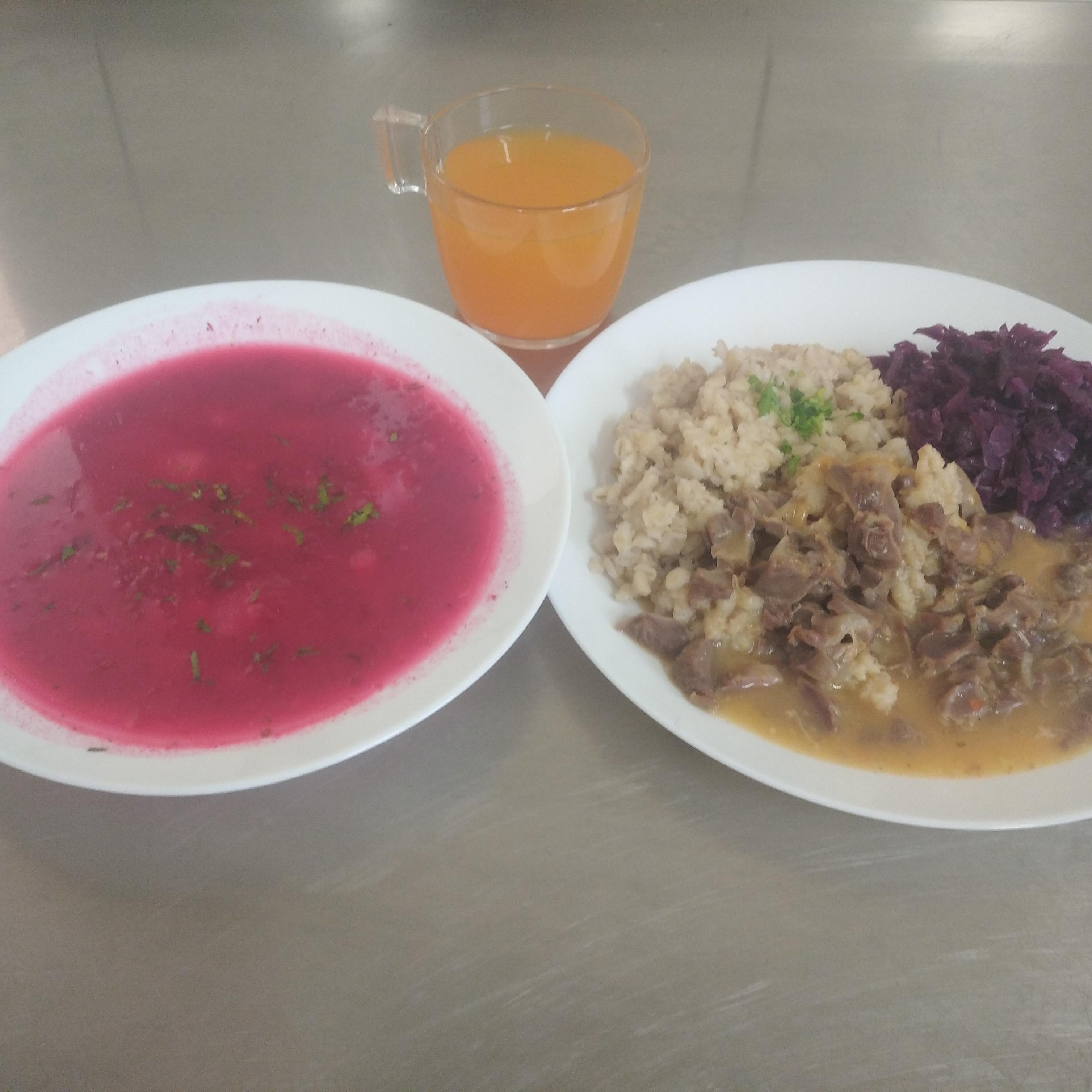 | obiad | barszcz czerwony 400ml(SEL,MLE,GLU), żołądki drobiowe 150g z kaszą pęczak 200g(GLU) kapusta czerwona 120g, kompot 200ml | barszcz czerwony 400ml(SEL,MLE,GLU) potrawka drobiowa 150ml (GLU,MLE) z kaszą 200g(GLU), marchewka 120g, brokuł 40g, kompot 200 ml | barszcz czerwony 400ml (SEL,MLE,GLU) potrawka drobiowa 150ml (MLE,GLU) z kaszą 200g(GLU), marchewka 120g, brokuł 40g, kompot 200 ml | barszcz czerwony 350g(SEL,MLE,GLU), potrawka drobiowa 150g(GLU) z kaszą 200g(GLU), sałatka z kapust czerwonej 100g brokuł 40g, woda 200ml, | |||