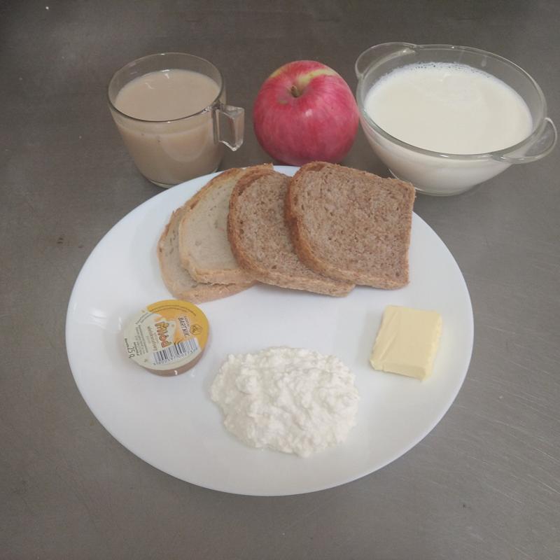 chleb 150g(GLU), masło 20g(MLE) ser biały 50g(MLE),miód 25g, dżem 25g, herbata 200 ml |