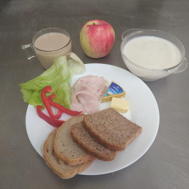 zupa mleczna z płatkami owsianymi 300ml(MLE, GLU), chleb/bułka 150g(GLU), masło 20g(MLE), kawa biała 200ml(MLE,GLU), blok szynkowy30g(GLU, GOR, SOJ), sałata, polędwica drobiowa 30g(GLU, GOR,SOJ), |
