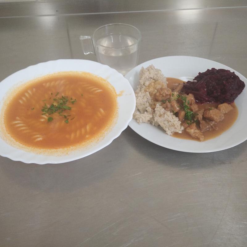 zupa pomidorowa z makaronem(GLU, MLE) 400ml, potrawka drobiowa 150g z jęczmienną 200g(GLU), buraczki 120g, kompot 200ml |