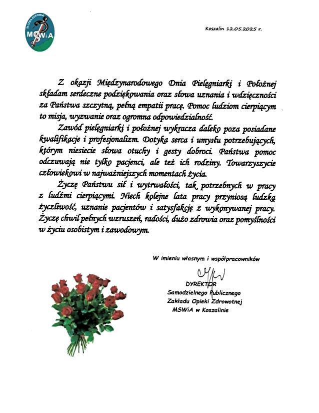 Z okazji Międzynarodowego Dnia Pielęgniarki i Polożnej składamy podziękowania i zapraszamy do zapoznania się z życzeniami, które w imieniu własnym i wszystkich współpracowników kieruje Dyrekcja SP ZOZ MSWiA w Koszalinie.