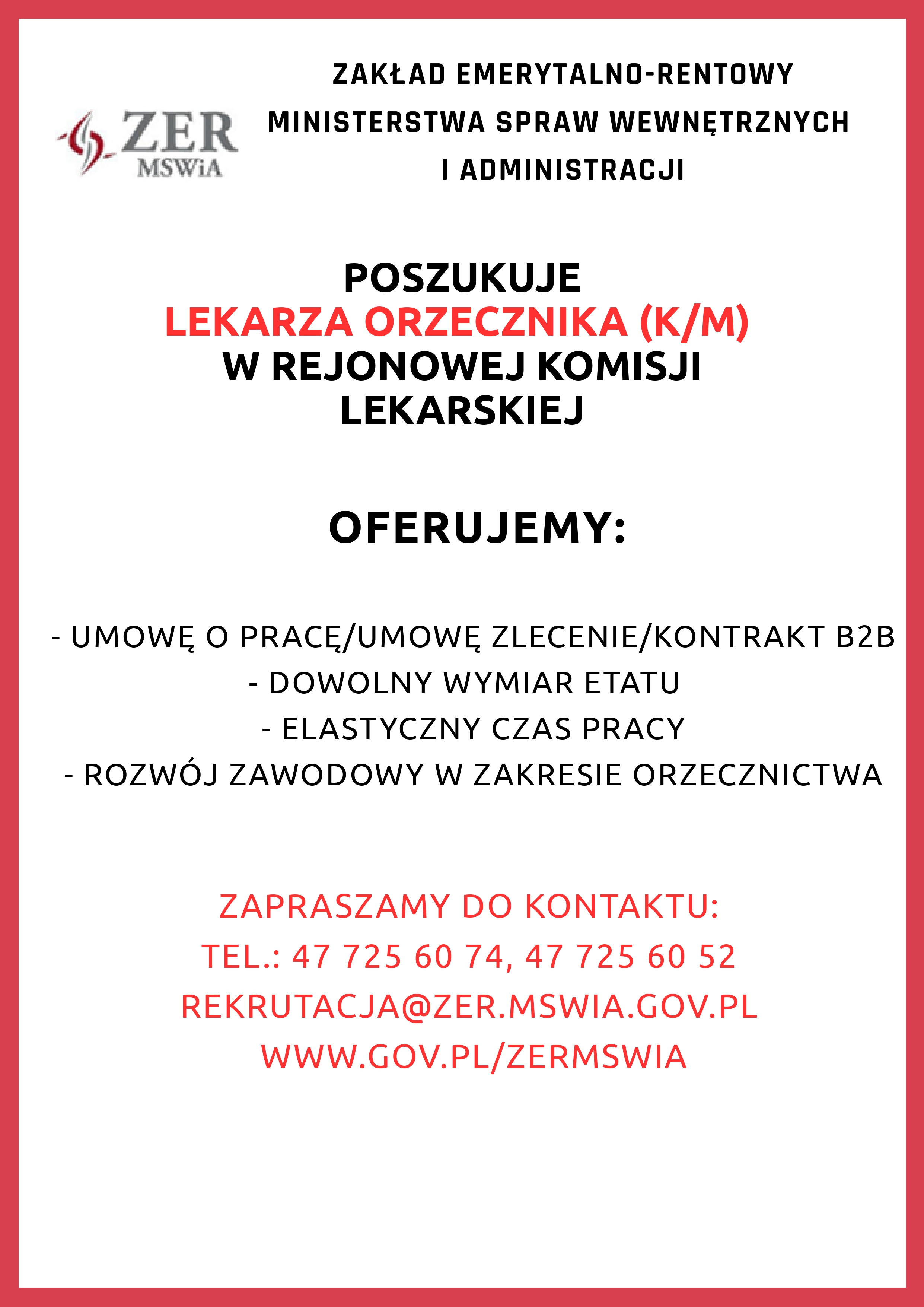 Zakład Emerytalno-Rentowy Ministerstwa Spraw Wewnętrznych i Administracji poszukuje Lekarza Orzecznika (K/M) w Rejonowej Komisji Lekarskiej