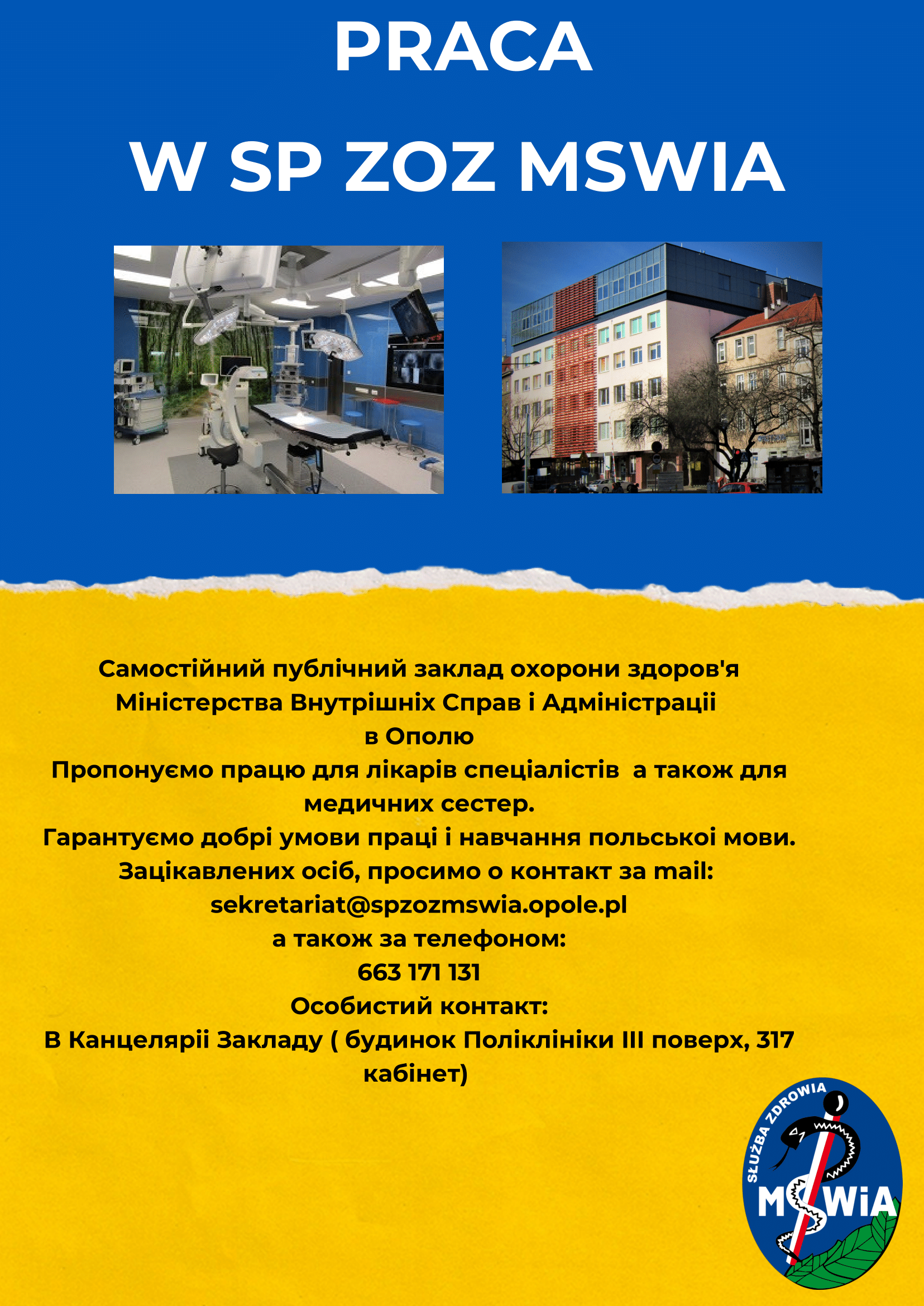 Самостійний публічний заклад охорони здоров'я Міністерства Внутрішніх Справ і Адміністраціі в Ополю Пропонуємо працю для лікарів спеціалістів а також для медичних сестер. Гарантуємо добрі умови праці і навчання польськоі мови. Зацікавлених осіб, просимо о контакт за mail: sekretariat@spzozmswia.opole.pl а також за телефоном: 663 171 131 Особистий контакт: В Канцеляріі Закладу ( будинок Поліклініки III поверх, 317 кабінет)