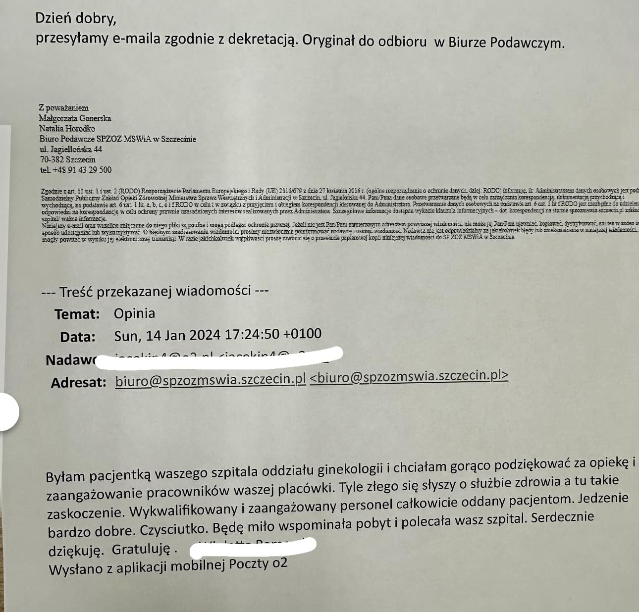 Zamieszczamy tutaj wszystkie podziękowania pisemne naszych pacjentów, i choć tych ustnych, złożonych bezpośrednio też słychać bardzo dużo.Tym razem pacjentka wychwala przebieg hospitalizacji w Oddziale Ginekologii, a dokładnie : wykwalifikowany i zaangażowany personel oddziału oddany pacjentkom,