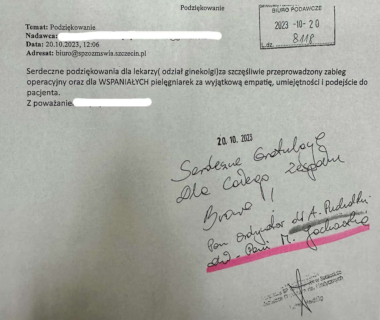 Właśnie i tym razem szczęśliwa pacjentka, która jest już po udanym zabiegu ginekologicznym dziękuje lekarzom i empatycznemu, profesjonalnemu zespołowi, szczególnie pielęgniarkom czyli, tym którzy tworzą Oddział Ginekologii.