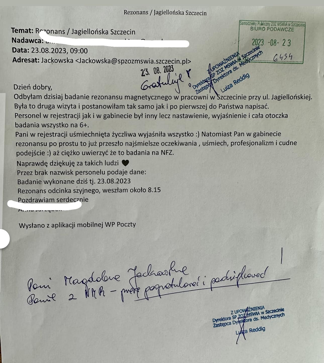 Pacjentka była na badaniu po raz drugi i tak jak za pierwszym razem jest zachwycona profesjonalnym podejściem, życzliwością zarówno Rejestratorek jaki i kulturą Technika wykonującego badanie. Wyraziła uznanie i podziękowanie za tak miłą atmosfere podczas badania. Dobrze się czyta takie wiadomości z samego rana!