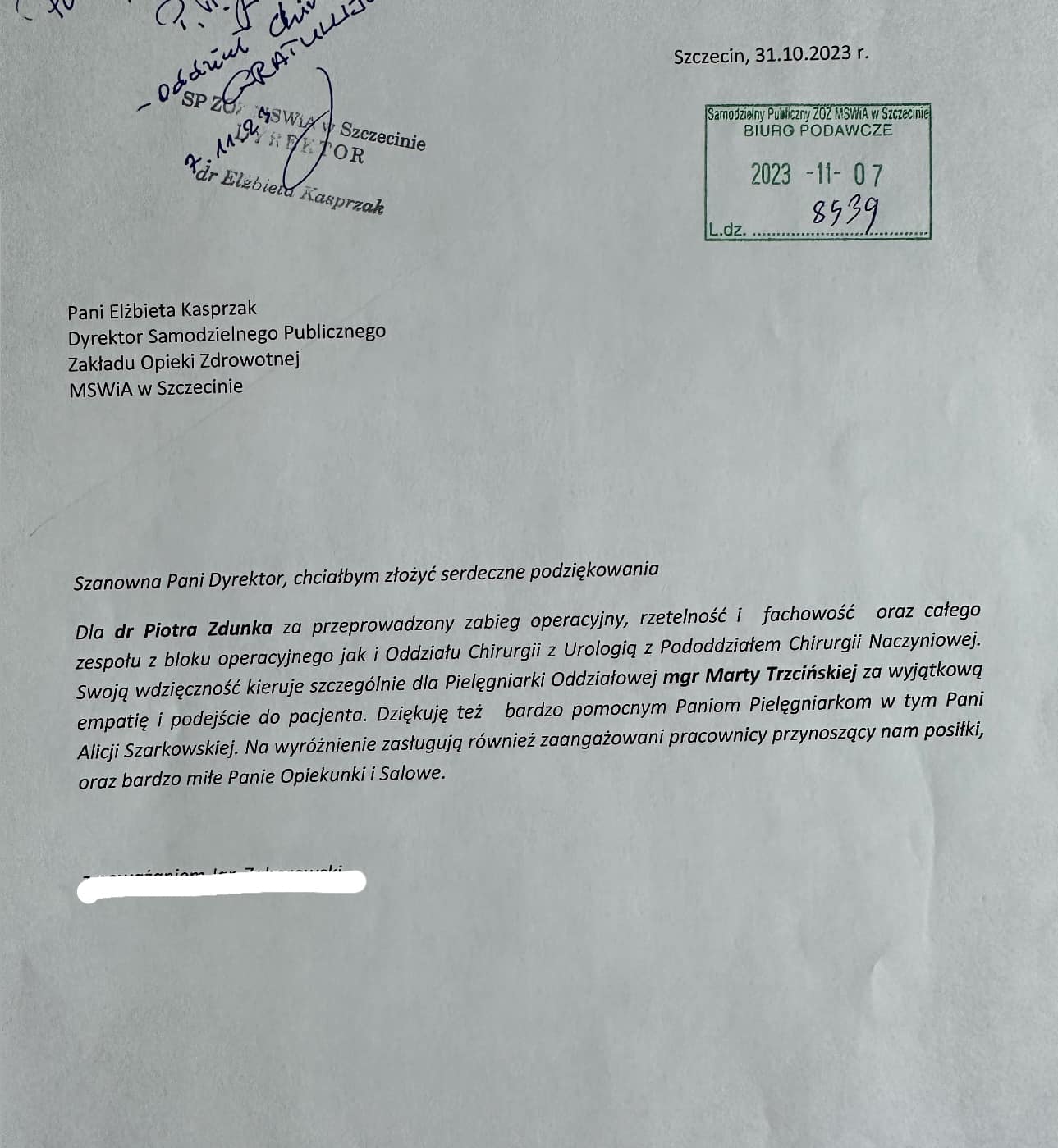 całemu personelowi szpitala za profesjonalne działania w procesie leczenia i pełne empatii oraz